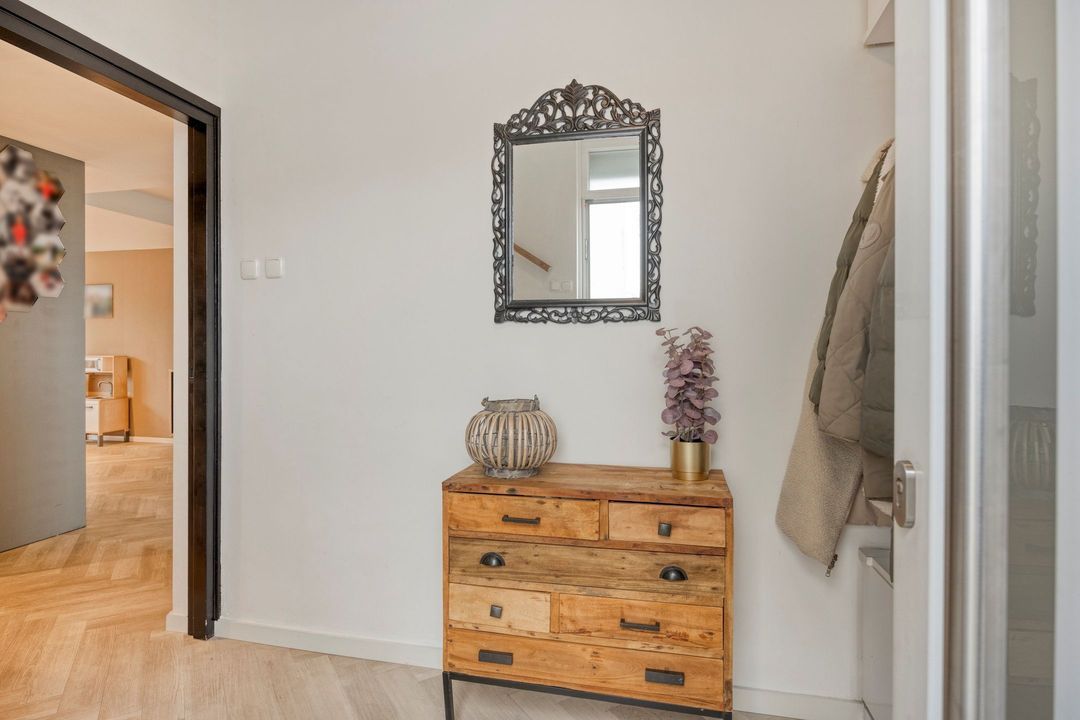 Via de ruime entree van ca. 6 m², voorzien van een stijlvolle visgraat pvc-vloer, betreedt u de woning. Vanuit de entree heeft u toegang tot de garderobe, de toiletruimte, de woonkamer met open keuken en de trap naar de eerste verdieping. De moderne toiletruimte is betegeld en voorzien van een hangcloset. De begane grond (m.u.v. garage en hal) is uitgerust met comfortabele vloerverwarming, wat het wooncomfort aanzienlijk verhoogt.