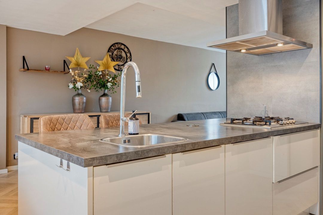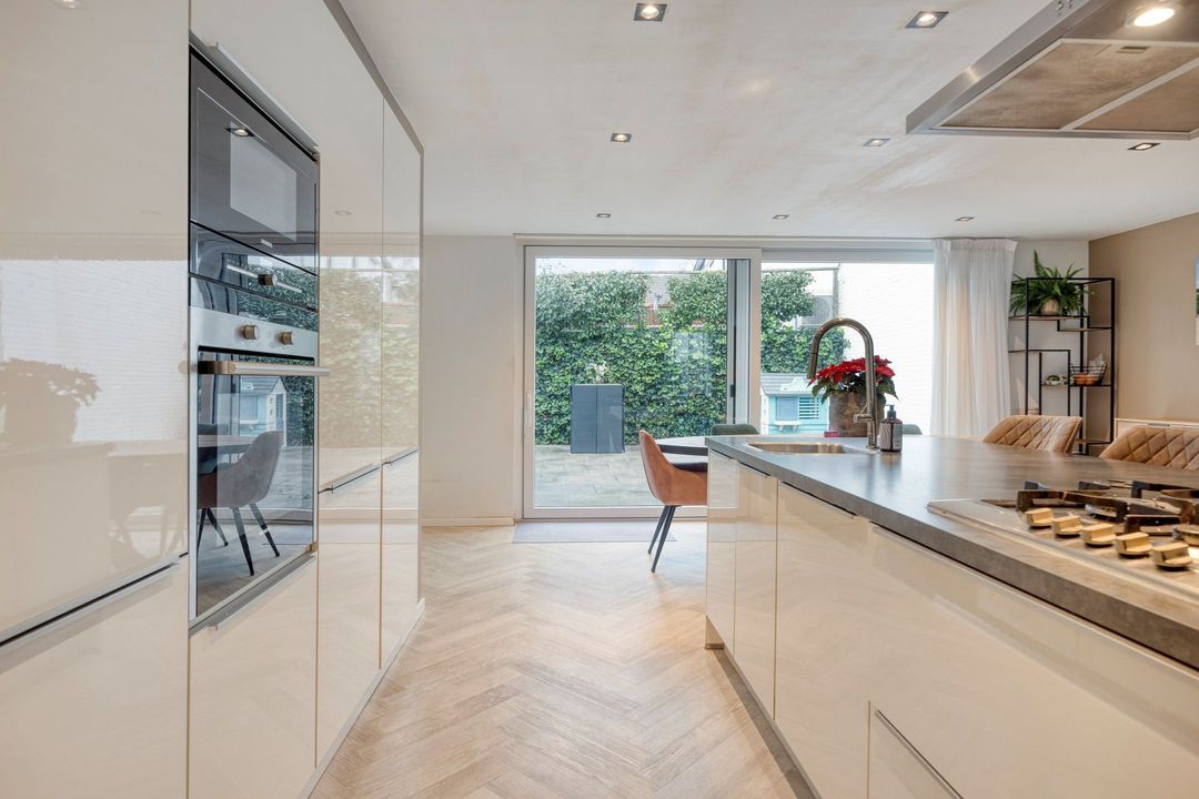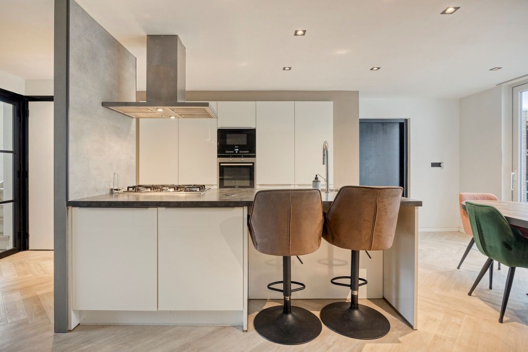De hoogwaardige, open keuken vormt het hart van de begane grond. Deze is afgewerkt met hoogglans witte fronten en beschikt over een stijlvol kookeiland met zitgedeelte. De keuken is uitgerust met een 5-pits gasfornuis, afzuigkap, oven, magnetron en koelkast. Dankzij de royale werk- en opbergruimte is deze keuken niet alleen visueel aantrekkelijk, maar ook bijzonder praktisch. Een deur in de keuken biedt toegang tot de kelder.