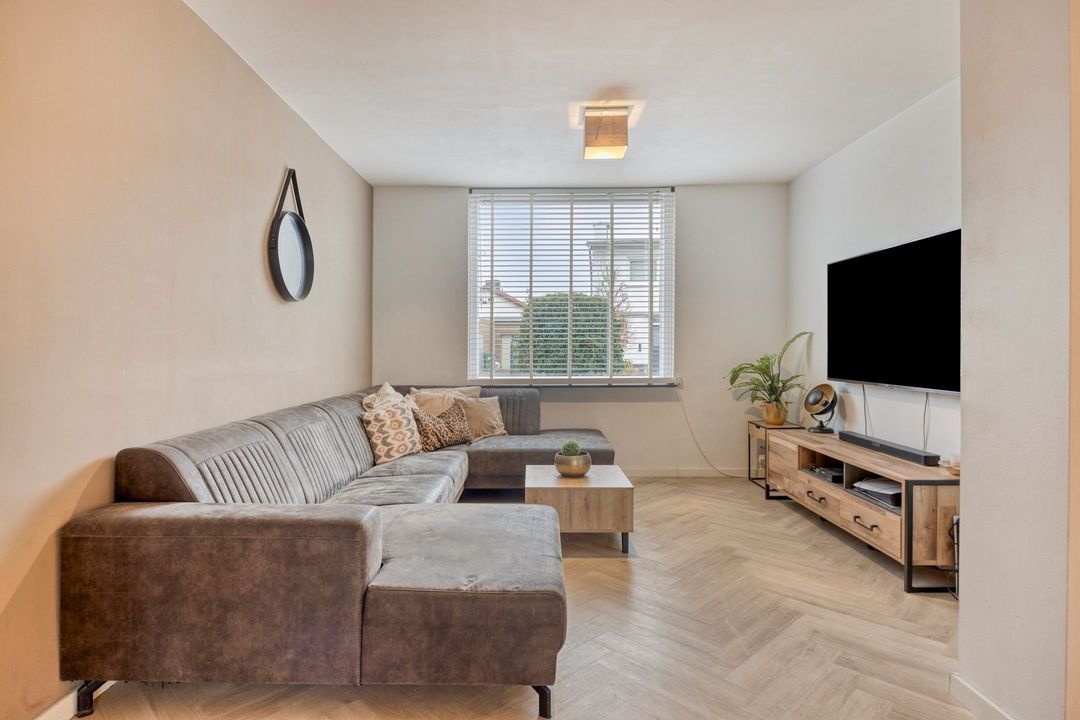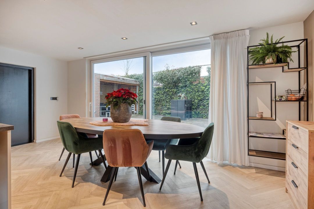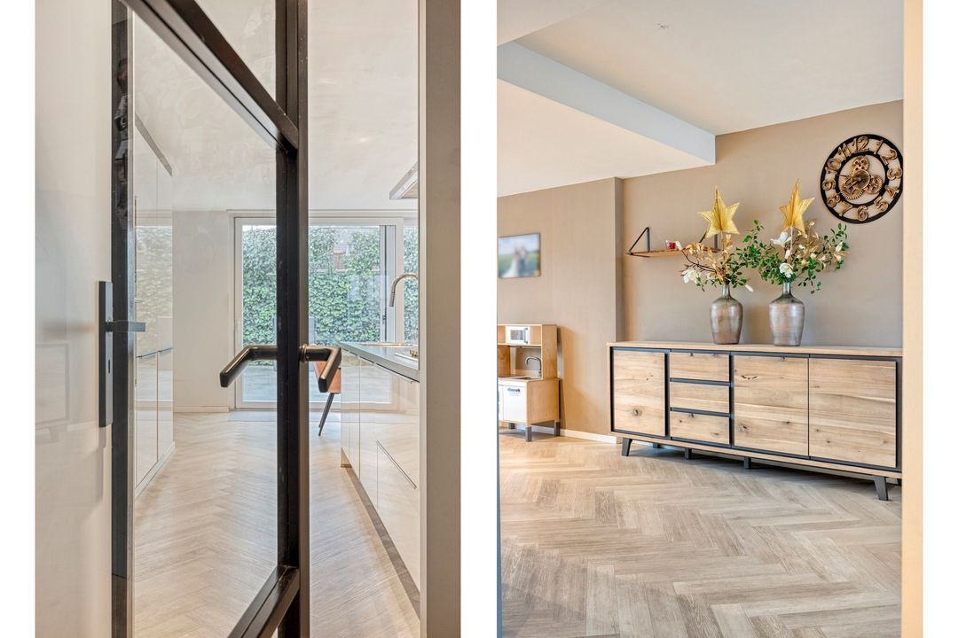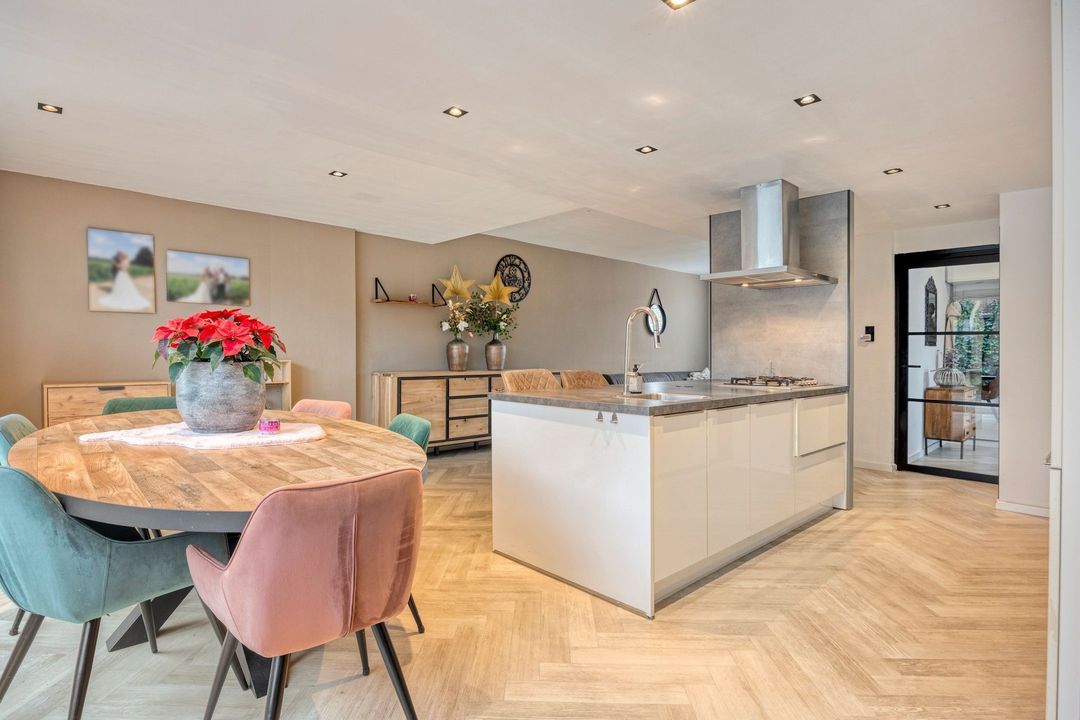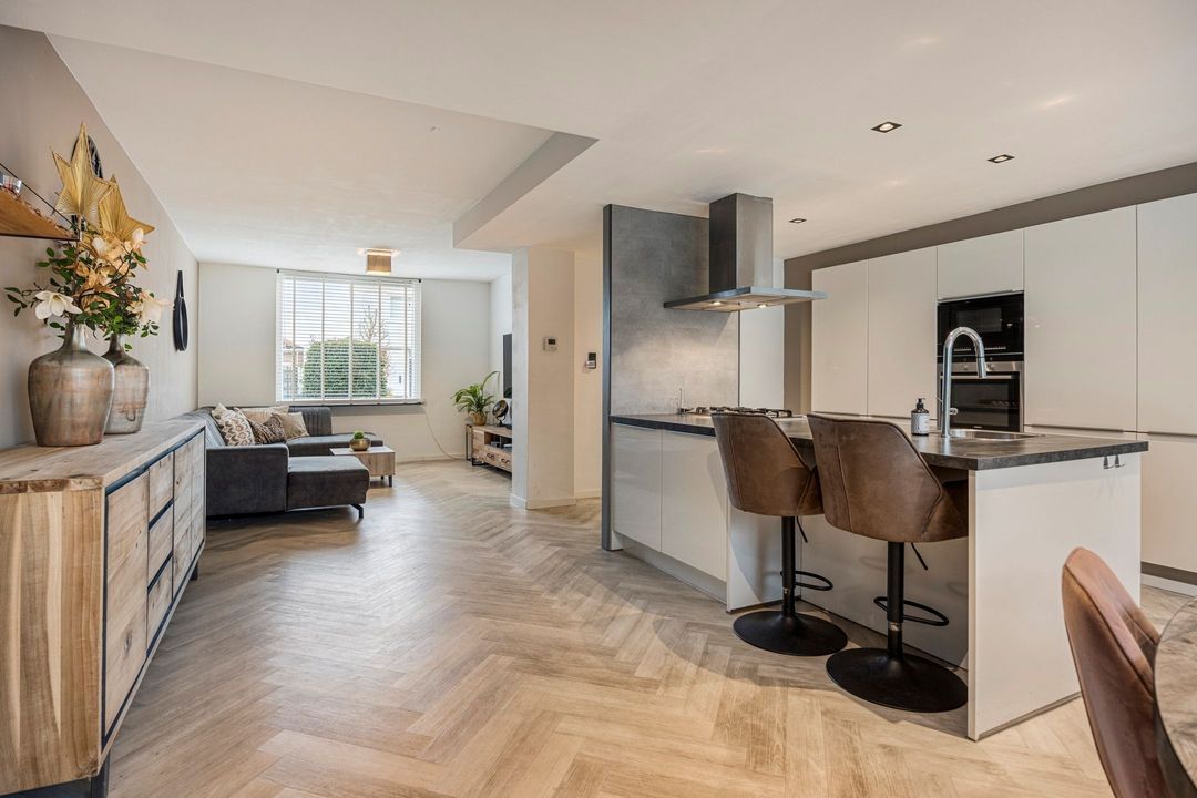 Via een fraaie zwartstalen deur bereikt u de royale, uitgebouwde woonkamer met open keuken. Samen vormen deze ruimtes circa 50 m² aan prettig leefoppervlakte. Dankzij de grote raampartijen en schuifpui geniet u hier van een uitstekende lichtinval en een open, ruimtelijk gevoel. De visgraat pvc-vloer loopt naadloos door in deze volledige leefruimte, wat bijdraagt aan de moderne en sfeervolle uitstraling.