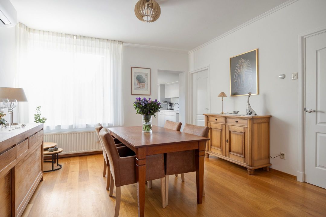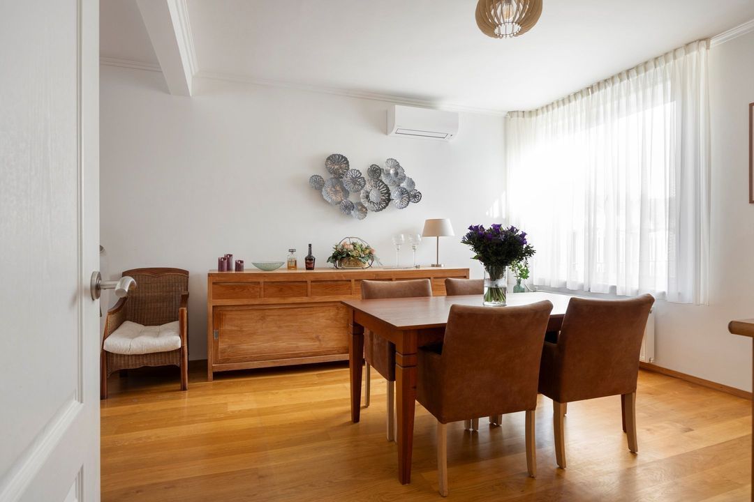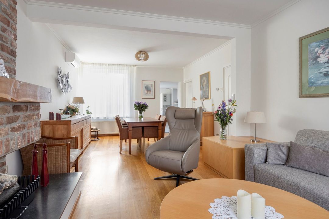 De ruime en keurig onderhouden woonkamer heeft een oppervlakte van circa 32 m² en is afgewerkt met een fraaie laminaatvloer. Dankzij de grote raampartijen aan zowel de voor- als achterzijde geniet de ruimte van een aangename en natuurlijke lichtinval. De aanwezige open haard vormt een sfeervol middelpunt en zorgt voor extra warmte en gezelligheid tijdens de koudere dagen. Daarnaast is de woonkamer uitgerust met een comfortabele airconditioning, wat bijdraagt aan een aangenaam binnenklimaat gedurende het hele jaar. Vanuit de woonkamer loopt u naadloos door naar de keuken.