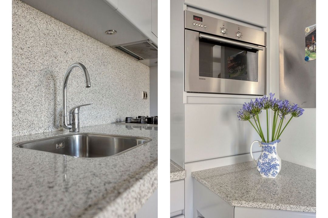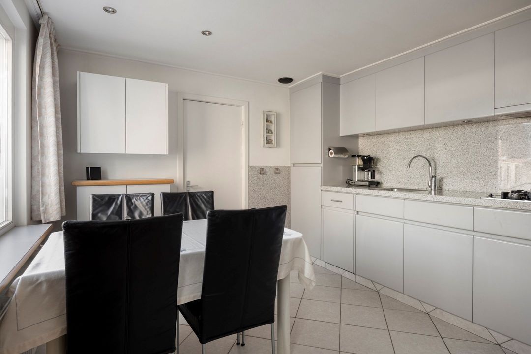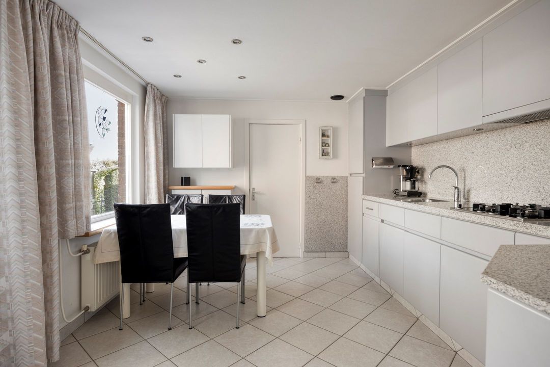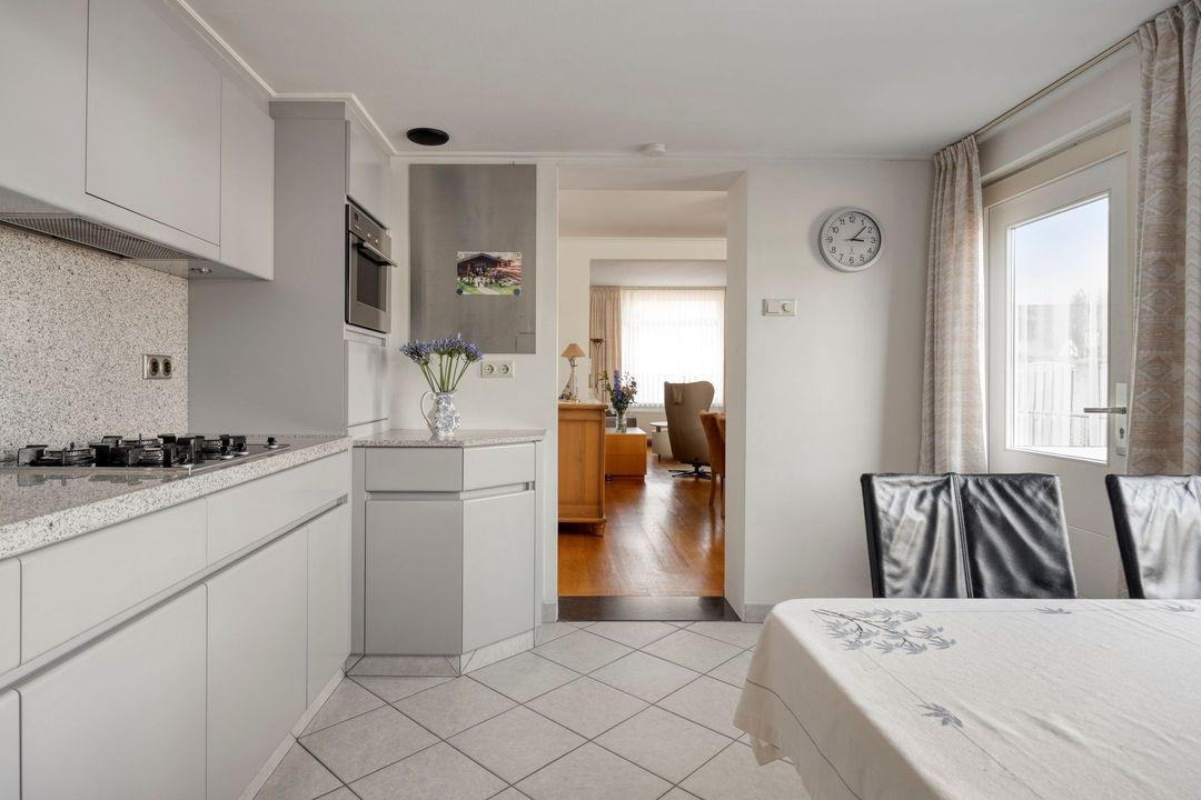 De goed onderhouden keuken, met een oppervlakte van circa 12 m², is voorzien van een praktische tegelvloer en beschikt over diverse inbouwapparatuur, waaronder een 4-pits gasfornuis, afzuigkap, vaatwasser, oven en koelkast. De aanwezige raampartijen en de deur naar de tuin zorgen voor een prettige lichtinval en een directe verbinding met buiten. Vanuit de keuken heeft u tevens toegang tot de bijkeuken.