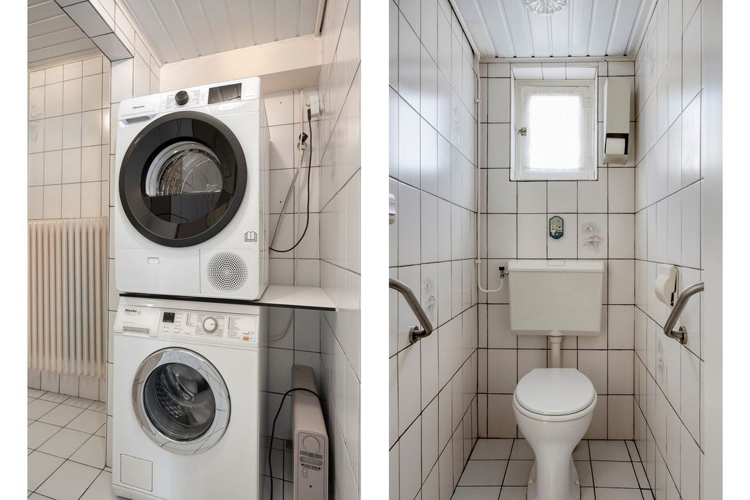 De bijkeuken is volledig betegeld en voorzien van aansluitingen voor witgoed. Daarnaast biedt deze ruimte voldoende plek voor het opbergen van voorraden en huishoudelijke spullen. Vanuit de bijkeuken bereikt u zowel de toiletruimte als de badkamer op de begane grond.