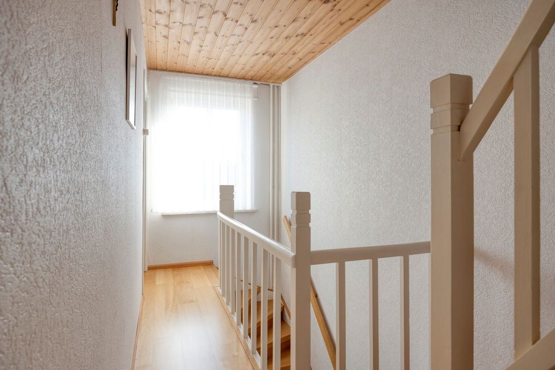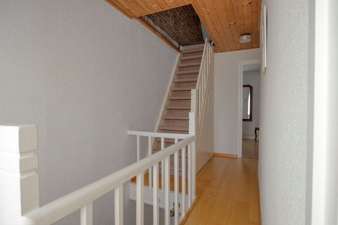 Via de trap in de entree bereikt u de overloop op de eerste verdieping. Vanaf hier heeft u toegang tot drie slaapkamers en de vaste trap naar de zolderverdieping.