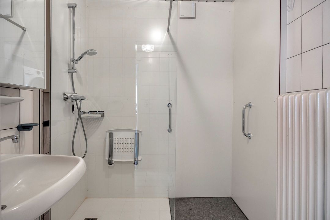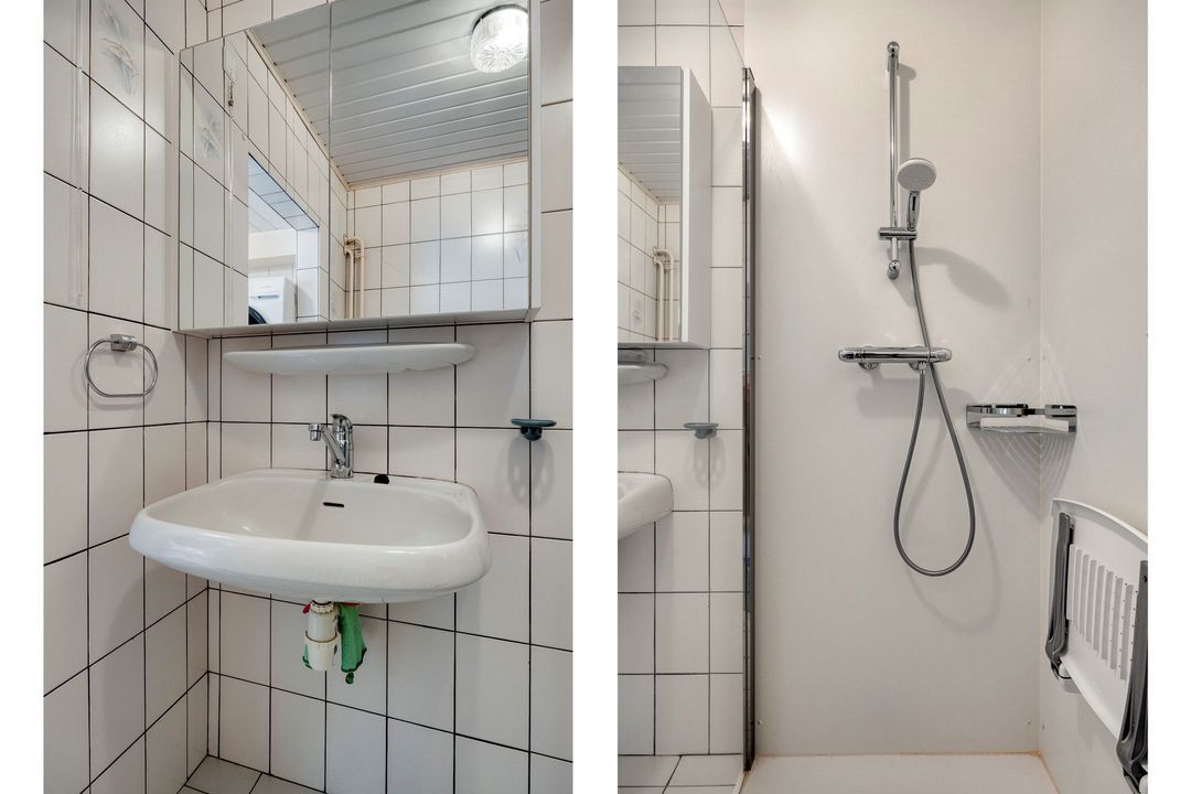 De nette toiletruimte is volledig betegeld en uitgerust met een modern hangcloset. De eveneens goed onderhouden badkamer heeft een oppervlakte van circa 3,5 m² en is voorzien van een inloopdouche en een wastafel, wat zorgt voor extra comfort en gebruiksgemak op de begane grond.