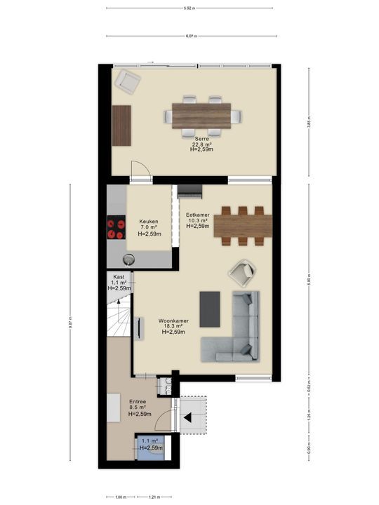 De moderne keuken is uitgerust met een inductiekookplaat (2023), afzuigkap (2023), vaatwasser en koelkast. Vanuit de keuken bereikt u de serre van ca. 23 m², een overdekte ruimte die het hele jaar door gebruikt kan worden en zorgt voor een prachtig contact met de tuin.
