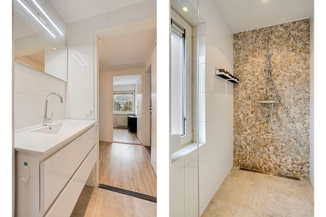 • Badkamer: Een nette, betegelde badkamer van ca. 4 m² met wastafel en ruime douche.