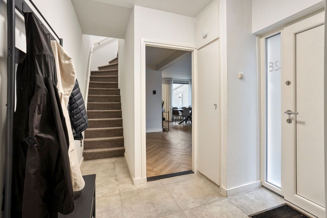 U betreedt de woning via een ruime hal van ca. 8,5 m² met een fraaie tegelvloer. Vanuit de hal heeft u toegang tot de toiletruimte met wandcloset, de trap naar de eerste verdieping en de sfeervolle woonkamer met open keuken.