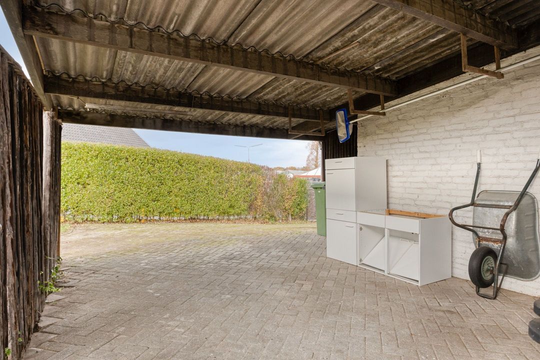 Aan de zijkant van het huis bevindt zich een ruime berging met daaraan grenzend een grote carport/overkapping. Een perfecte plek voor het stallen van fietsen, het parkeren van een voertuig of het opbergen van tuinmaterialen. Prettig is ook de extra parkeerplaatsen aan de zijkant.