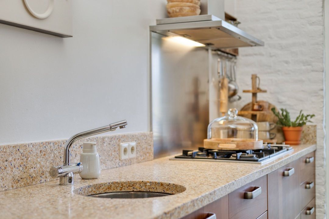 De ruime, landelijke keuken is voorzien van een tegelvloer en een prettige plafondhoogte. De keuken is volledig uitgerust met een 5-pits gasfornuis, afzuigkap, combi-oven, koelkast en vaatwasser. Vanuit de keuken is er toegang tot de tuin, de bijkeuken én de vide van de eerste verdieping.