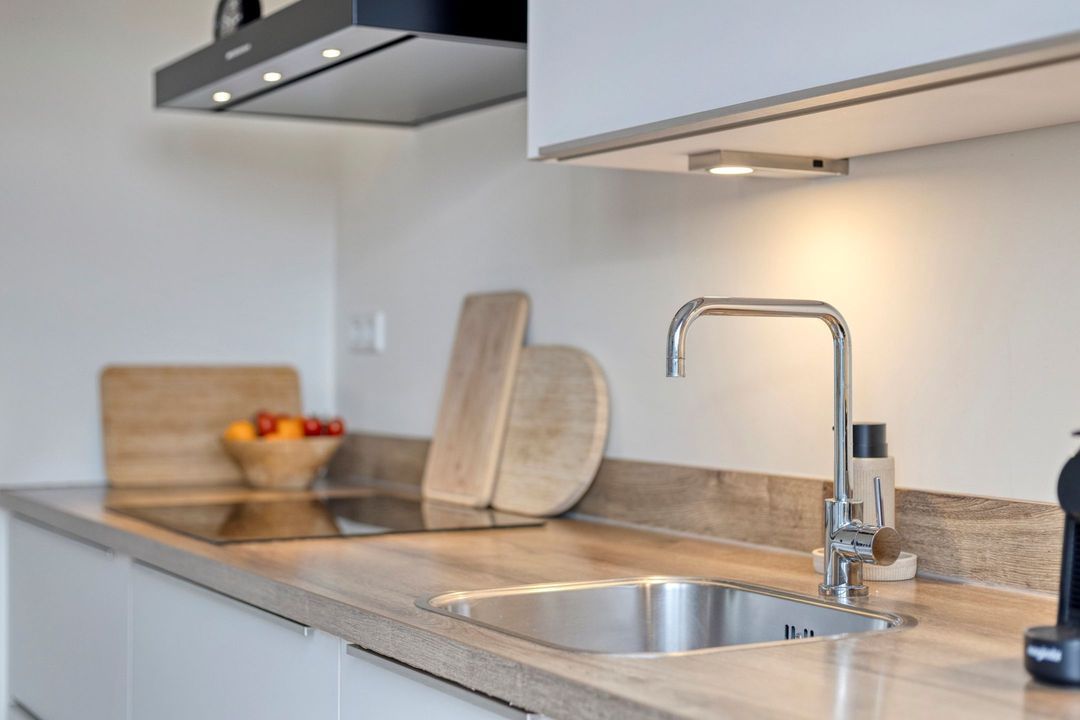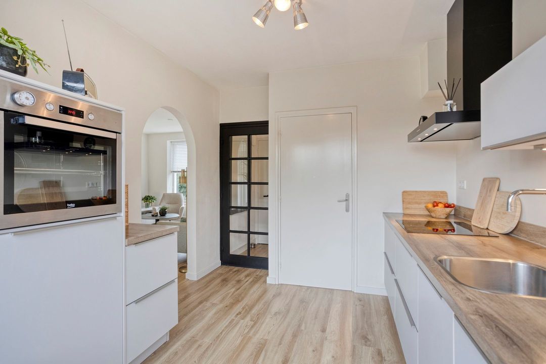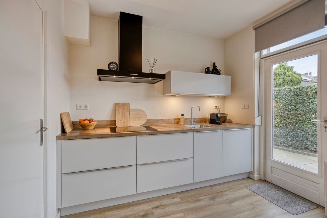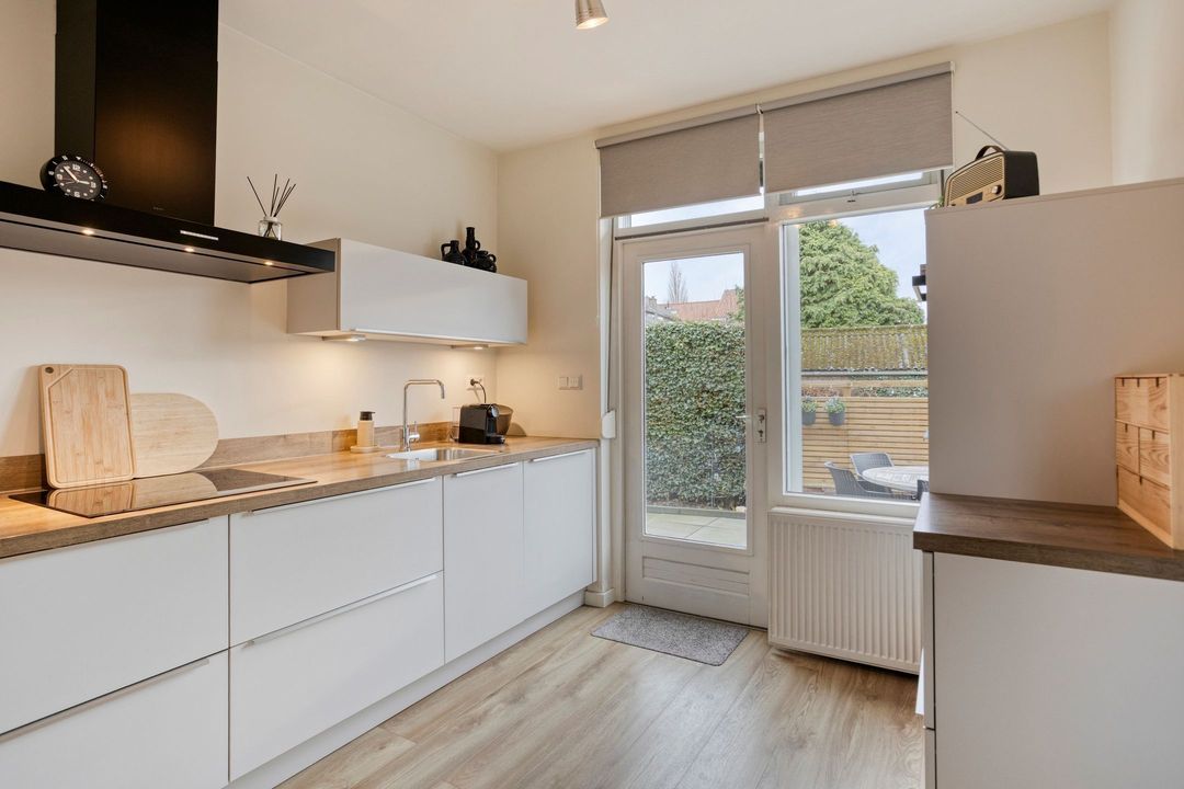 De lichte keuken (ca. 8,5 m²) beschikt over een groot raam en een deur naar de achtertuin. De moderne keuken is uitgerust met onder andere een inductiekookplaat, afzuigkap, combi-oven en koelkast.