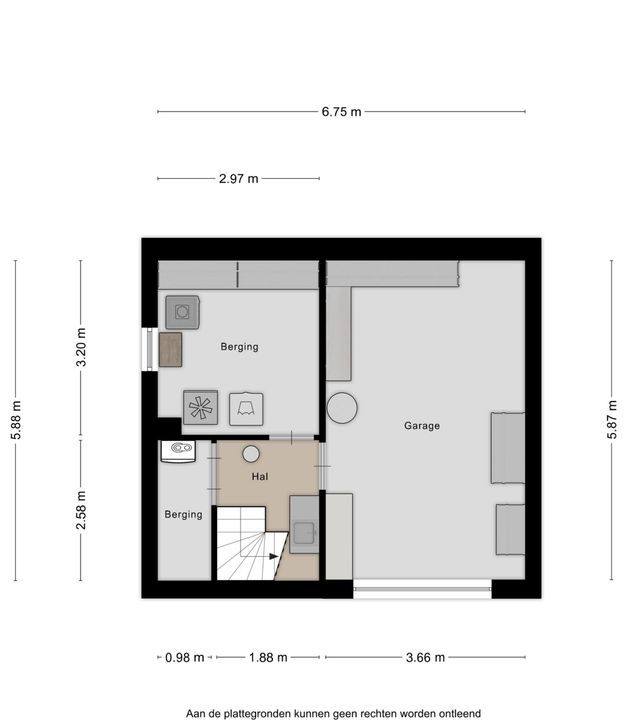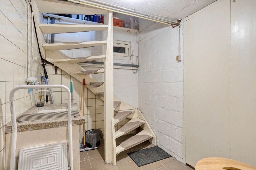 Vanuit de trap in het souterrain bereikt u de hal (ca. 5 m²) in het souterrain. Vanuit hier heeft u toegang tot twee bergingen en de garage. Het souterrain biedt praktische ruimte en extra comfort, ideaal voor opslag of hobbygebruik.