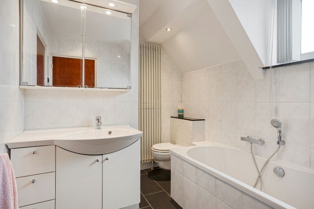 • Badkamer 1: Deze nette en betegelde badkamer is ca. 6 m² groot en uitgerust met een ligbad met douche, een wastafel en een hangcloset.