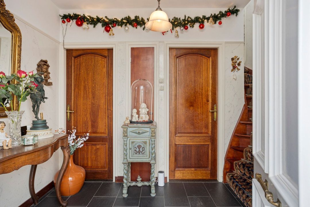 U betreedt de woning via de entree van circa 6 m², afgewerkt met een stijlvolle tegelvloer. Hier bevinden zich de meterkast, de toiletruimte, de trap naar de eerste verdieping en de toegang tot de woonkamer. De moderne toiletruimte is betegeld en voorzien van een hangcloset en fonteintje. Via een tussenhal komt u bij de keuken en een handige kastruimte.