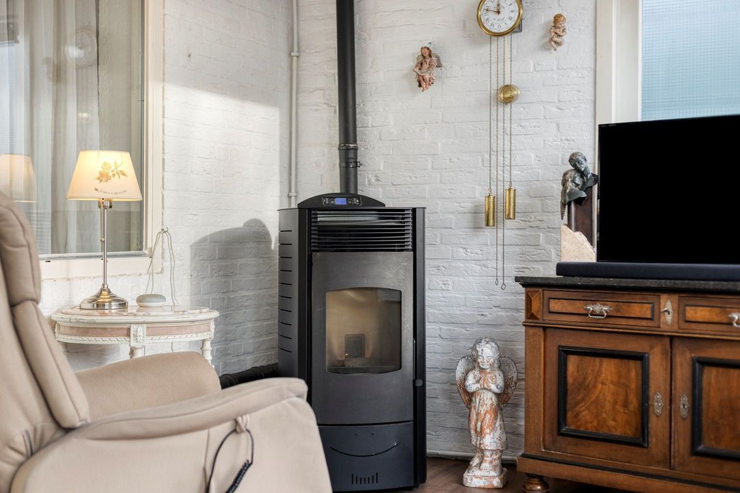 Vanuit de woonkamer loopt u via een openslaande deur de royale serre van circa 20 m² binnen. De serre biedt veel natuurlijk licht, een gezellige pallet kachel en een directe verbinding met de tuin via de schuifpui maken dit een plek waar u het hele jaar door van buitenleven kunt genieten, ongeacht het weer.