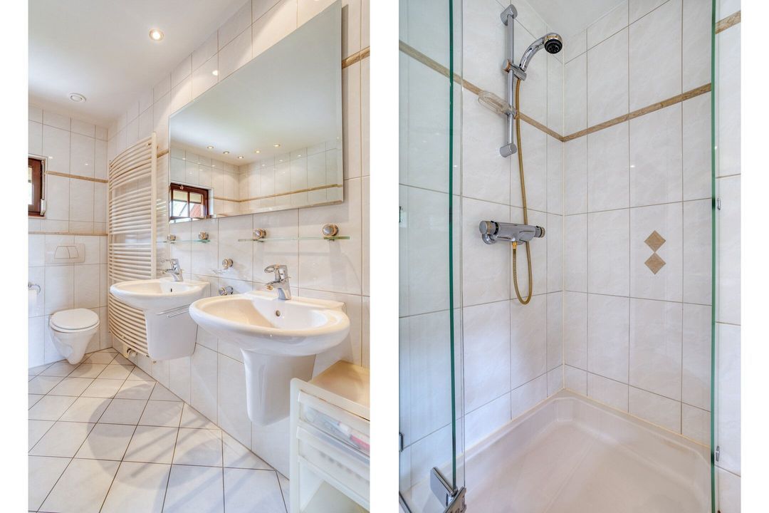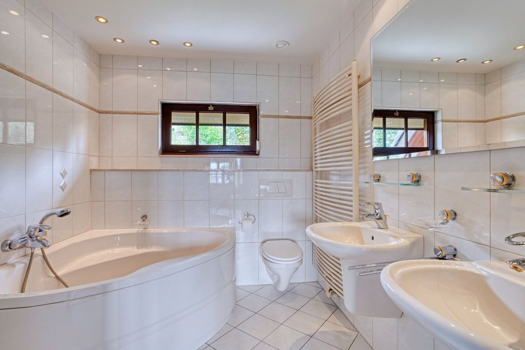 • Badkamer: Deze goed onderhouden, ruime badkamer is betegeld en uitgerust met een douchecabine, een ligbad, twee wastafels, een hangcloset en een handdoekradiator.