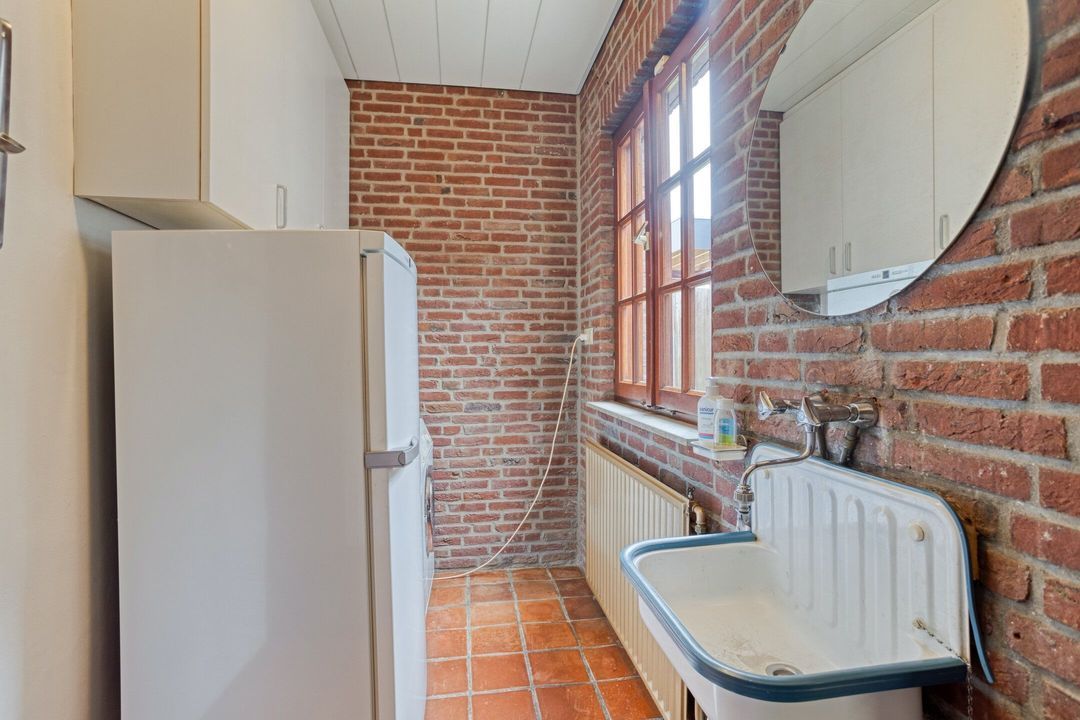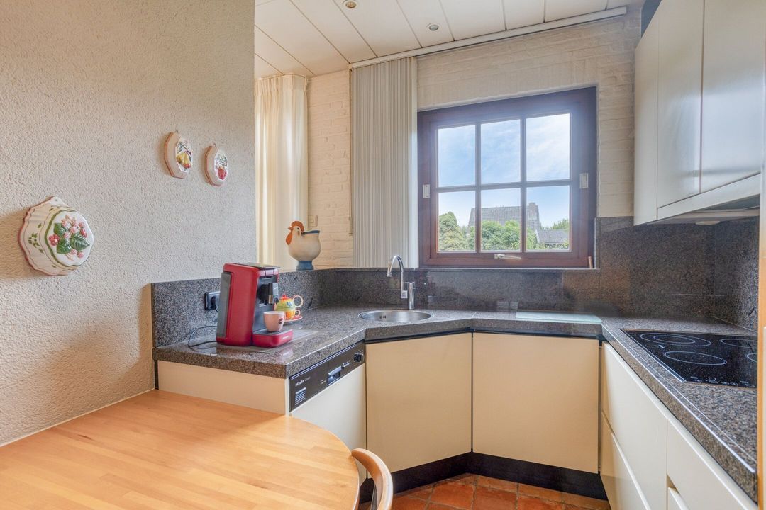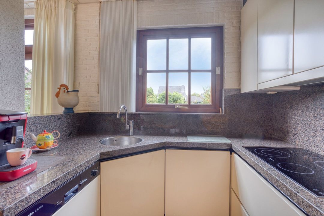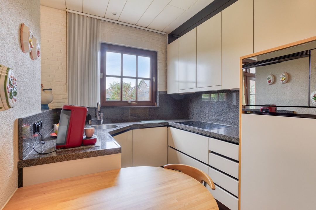 De semi-open keuken, gelegen aan de achterzijde van de woning, is goed onderhouden en uitgerust met hoogwaardige apparatuur van Miele, waaronder een elektrische kookplaat, afzuigkap, oven, vaatwasser en koelkast. Vanuit de keuken is de praktische bijkeuken bereikbaar, voorzien van een spoelbak en extra bergruimte, en biedt toegang tot de garage.