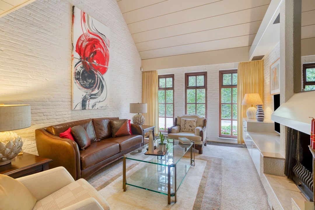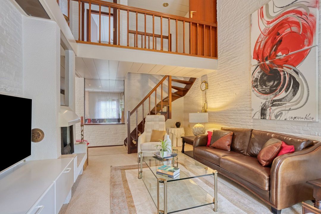 Een gedeelte van de woonkamer (ca. 21 m²) is split level gelegen. Hier ligt vloerbedekking en zorgen de karakteristieke schouw met houtkachel en het hoge plafond voor een warme, landelijke uitstraling.