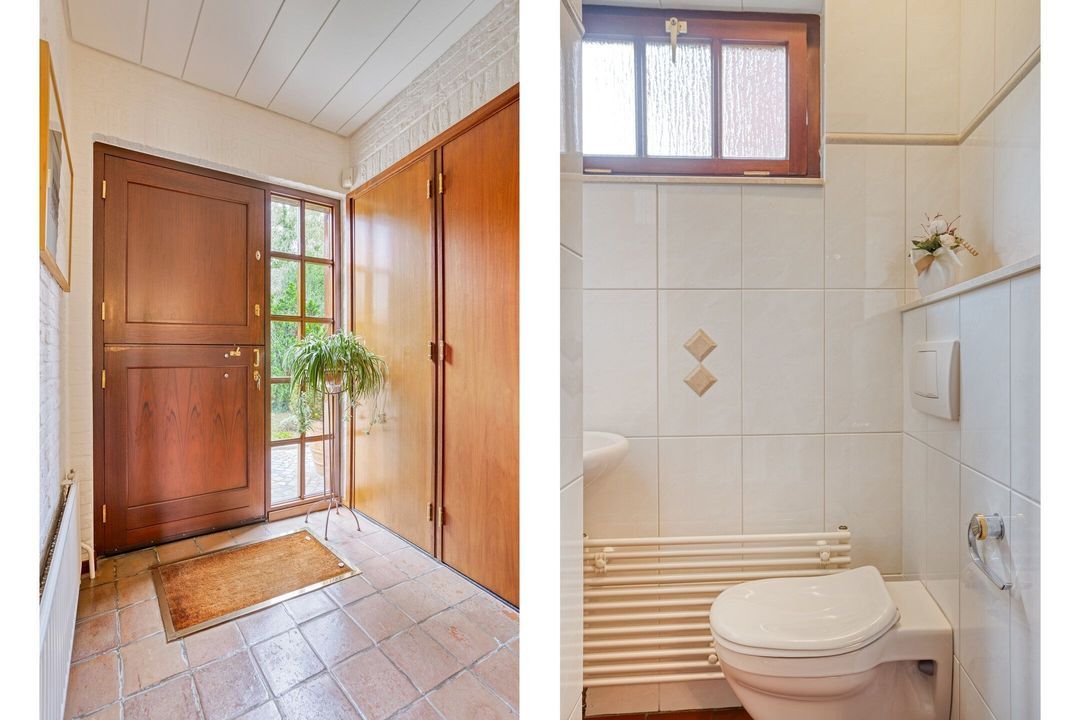 De royale entree, voorzien van een donkere tegelvloer, biedt toegang tot de meterkast, het toilet, de woon-/eetkamer met semi-open keuken en de trap naar het souterrain. Het toilet is keurig betegeld en uitgerust met een hangcloset en fonteintje.