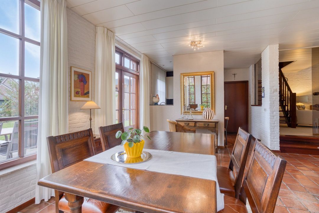 De ruime woon-/eetkamer met semi-open keuken, van samen ca. 32 m² groot, ademt sfeer en charme. De grote hoge raampartijen laten veel natuurlijk licht binnenvallen en bieden een prachtig zicht op de tuin, waardoor binnen en buiten op een mooie manier met elkaar verbonden zijn. Via de openslaande deuren aan de achterzijde stapt u zo het terras op, ideaal voor het genieten van zonnige dagen of gezellige avonden buiten.