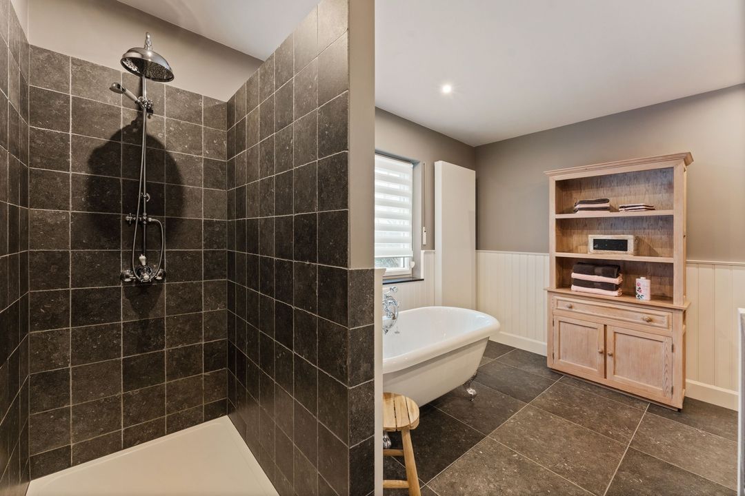 De stijlvolle badkamer van circa 12 m² beschikt over een vrijstaand ligbad, een inloopdouche, een dubbele wastafel en een separaat toilet.