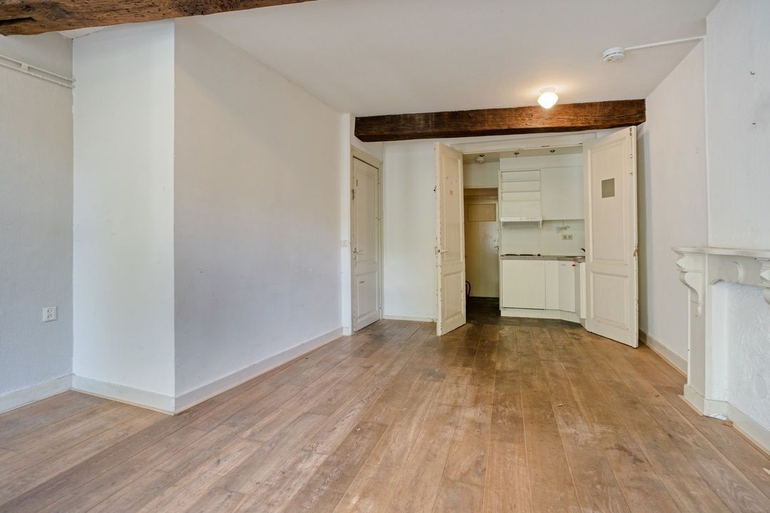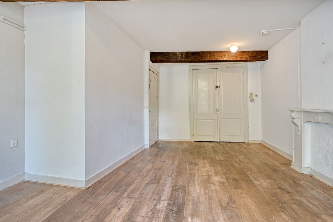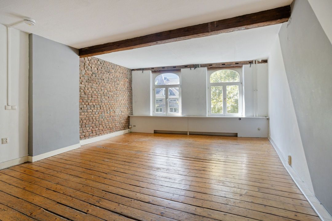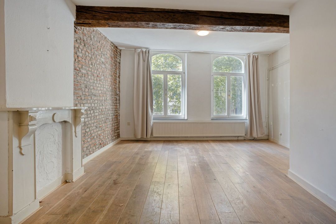 De woonkamer (ca. 27 m²) straalt dezelfde charme uit als die van het eerste appartement, met houten vloeren, balkenplafond en een karakteristieke schouw. Ook hier zorgen de hoge rondboogvensters met houten T-ramen en gepleisterde omlijstingen voor een bijzonder ruimtelijk effect en een prachtig uitzicht op de Boschstraat.