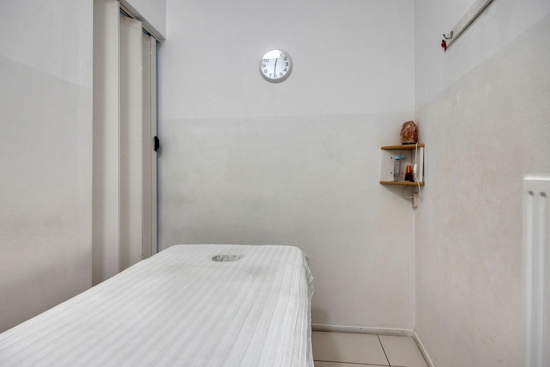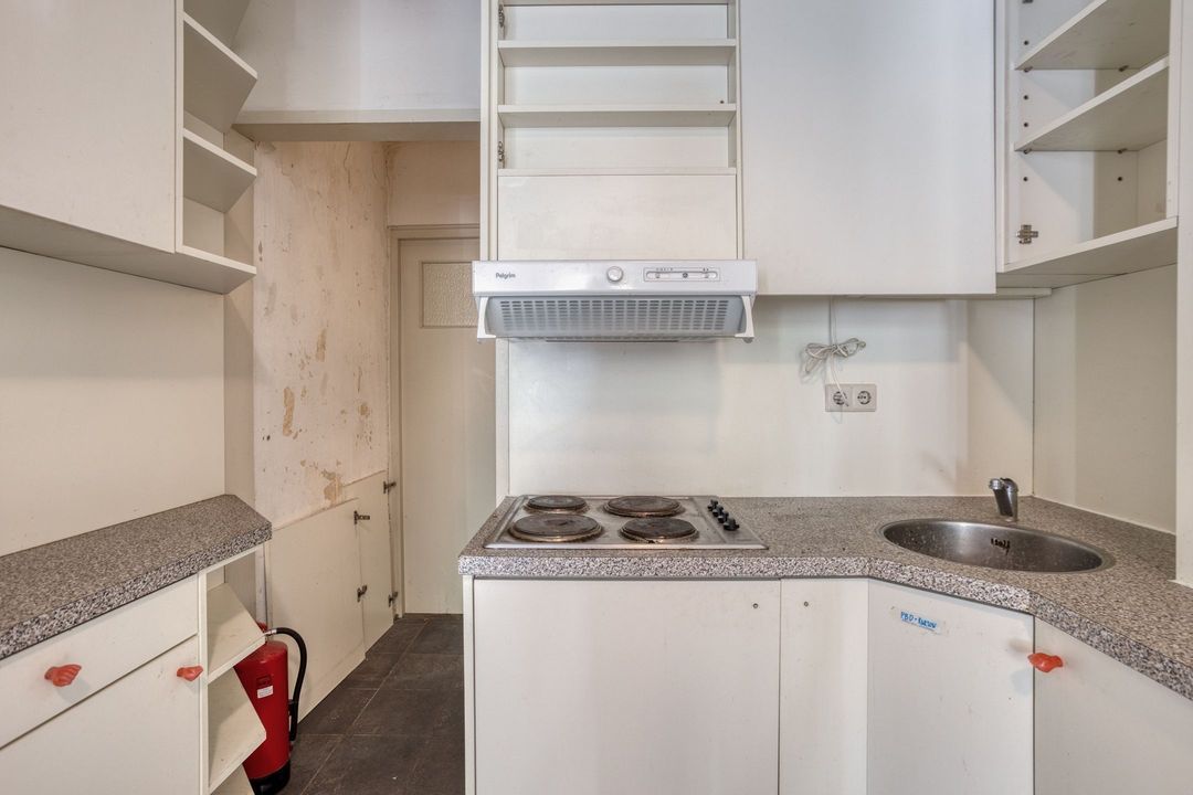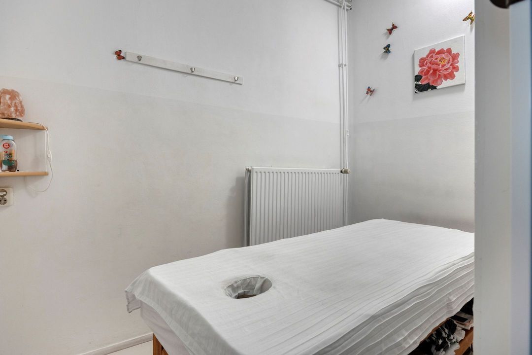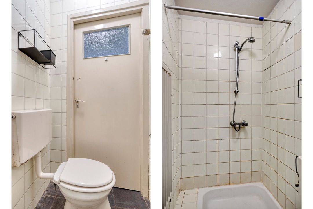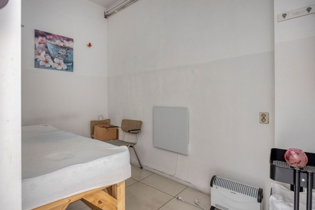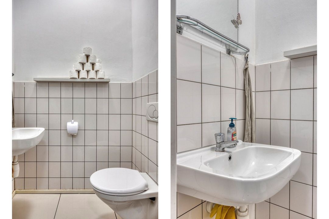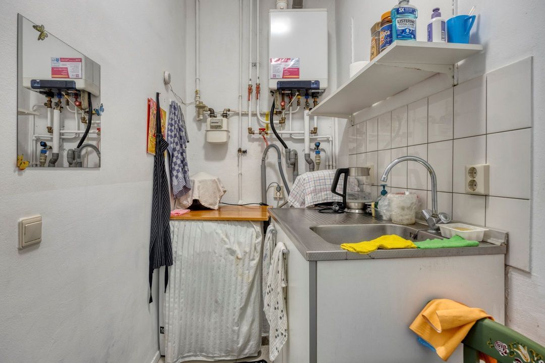 Vanuit de winkelruimte zijn twee extra ruimtes bereikbaar van respectievelijk ca. 10 en 13 m². Deze worden momenteel gebruikt als praktijkruimtes, maar zijn uiteraard multifunctioneel inzetbaar. Aangrenzend bevindt zich een pantry van ca. 8 m², voorzien van een keukenblok met spoelbak en opbergruimte, evenals de cv-installatie (Intergas, bouwjaar onbekend). Vanuit de pantry bereikt u tevens de toiletruimte, die gedeeltelijk betegeld is en is uitgerust met een staand closet en fonteintje. De lichte tegelvloer loopt door in alle ruimtes, waardoor een rustig en ruimtelijk geheel ontstaat. In de hal van ca. 3 m² vindt u de trap naar de kelder.