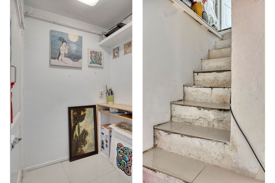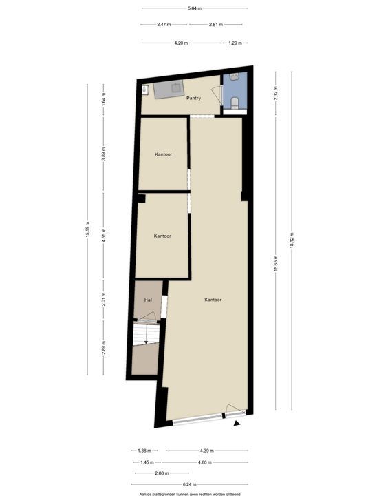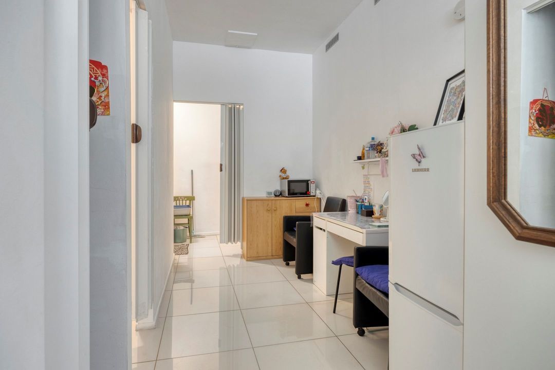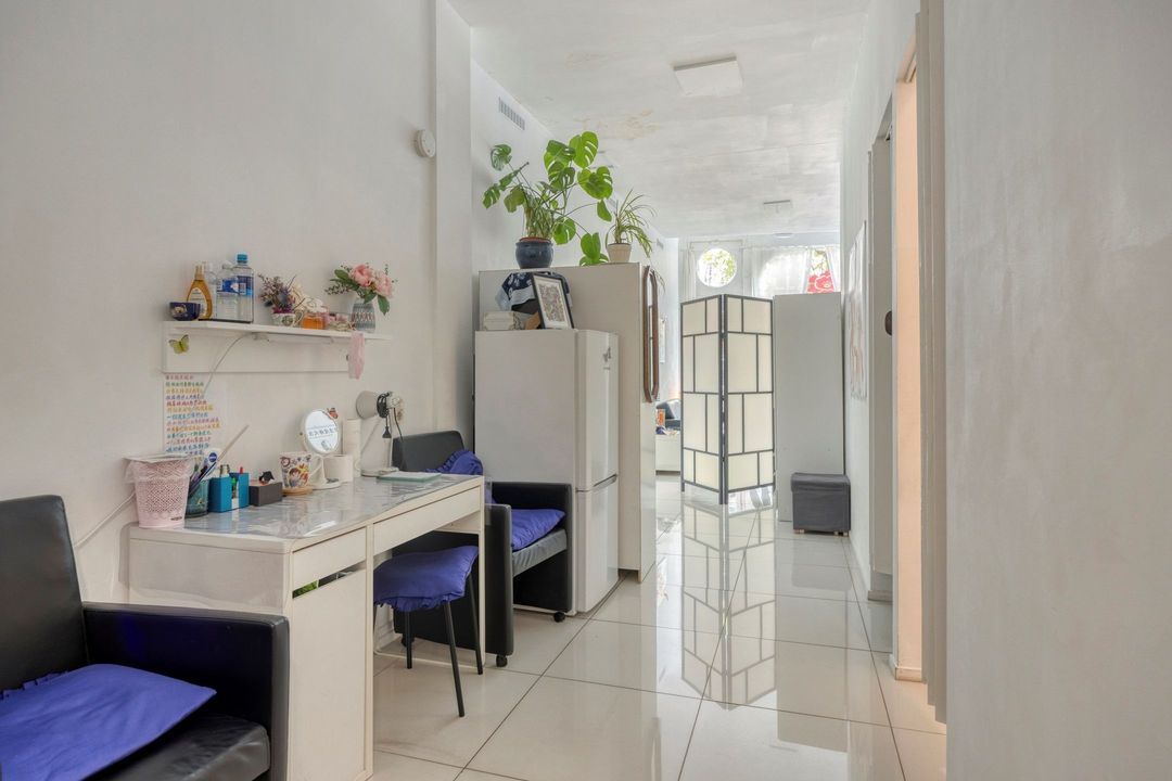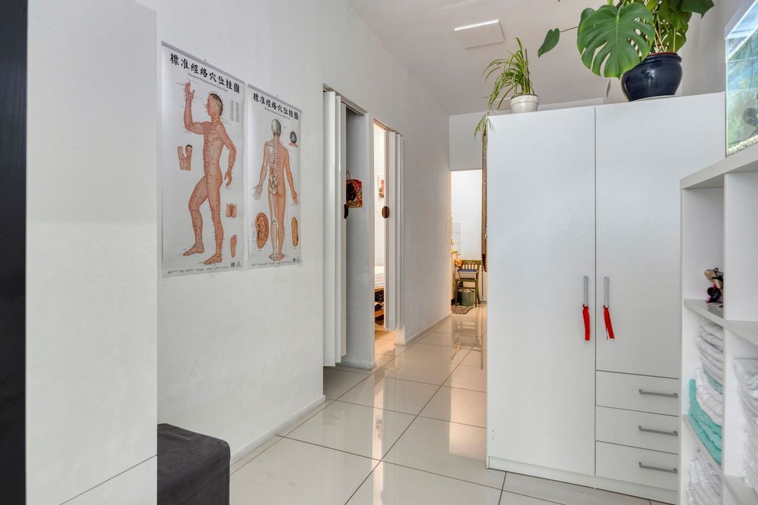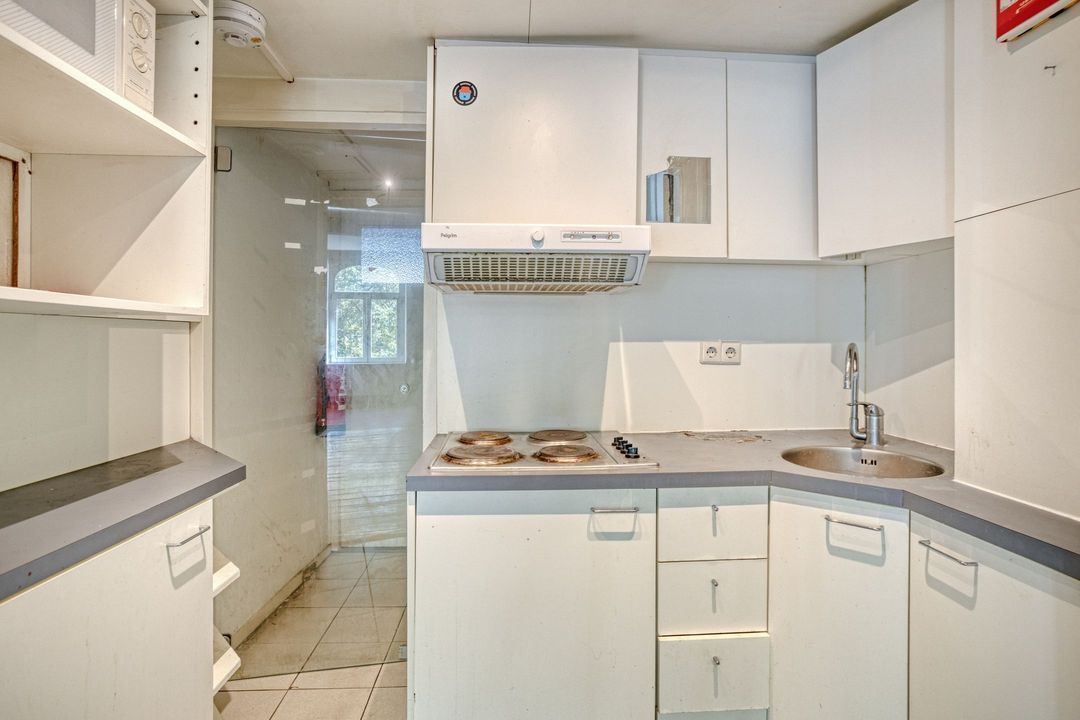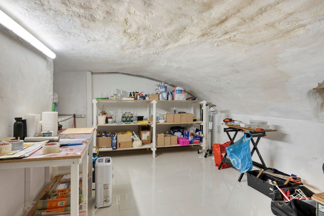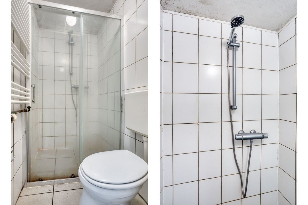 Vanuit de winkelruimte zijn twee extra ruimtes bereikbaar van respectievelijk ca. 10 en 13 m². Deze worden momenteel gebruikt als praktijkruimtes, maar zijn uiteraard multifunctioneel inzetbaar. Aangrenzend bevindt zich een pantry van ca. 8 m², voorzien van een keukenblok met spoelbak en opbergruimte, evenals de cv-installatie (Intergas, bouwjaar onbekend). Vanuit de pantry bereikt u tevens de toiletruimte, die gedeeltelijk betegeld is en is uitgerust met een staand closet en fonteintje. De lichte tegelvloer loopt door in alle ruimtes, waardoor een rustig en ruimtelijk geheel ontstaat. In de hal van ca. 3 m² vindt u de trap naar de kelder.