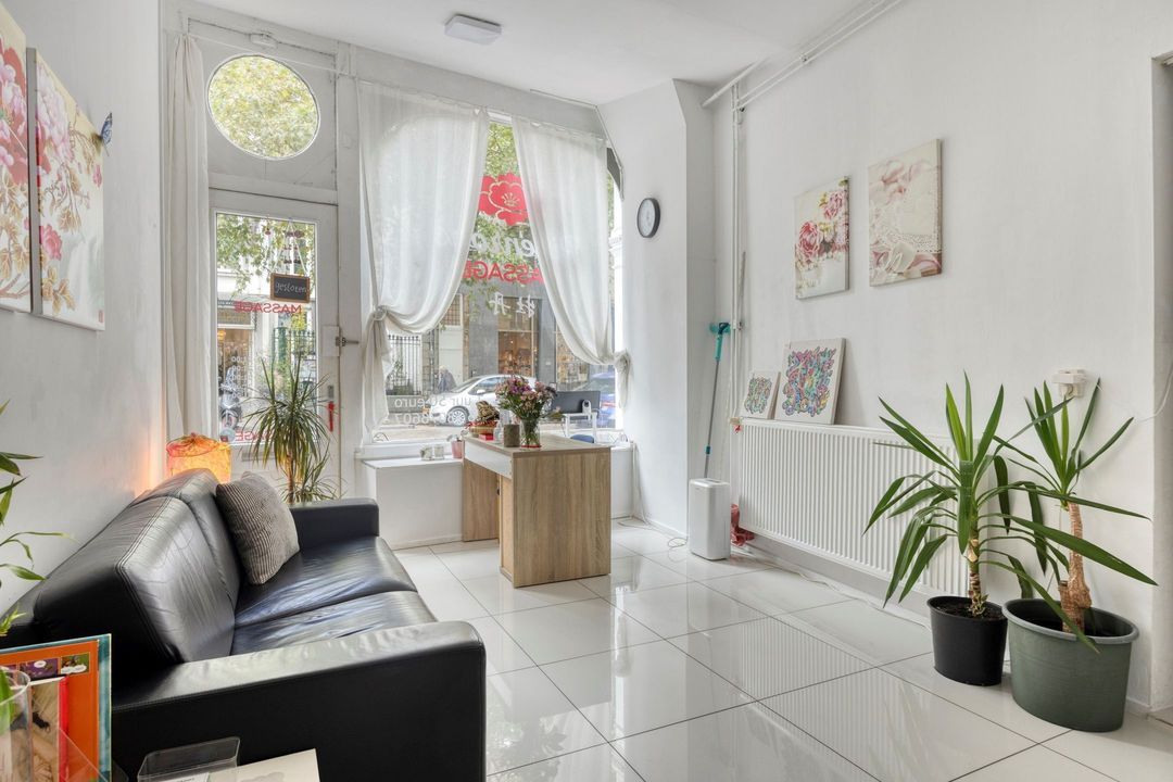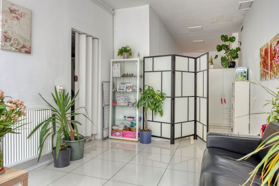 Via de glazen voordeur betreedt u de commerciële ruimte. U komt direct binnen in een royale winkelruimte van ca. 57 m², afgewerkt met een lichte tegelvloer. De grote winkelpui aan de voorzijde, uitgevoerd met een hardstenen plint en houten stijlen met rijk snijwerk, zorgt voor een prachtige uitstraling. De pui wordt bovendien bekroond door een fraai gedecoreerde kroonlijst, waardoor het geheel een statige indruk maakt. Dankzij de royale raampartijen valt veel natuurlijk licht naar binnen, wat de ruimte een uitnodigende en open sfeer geeft.