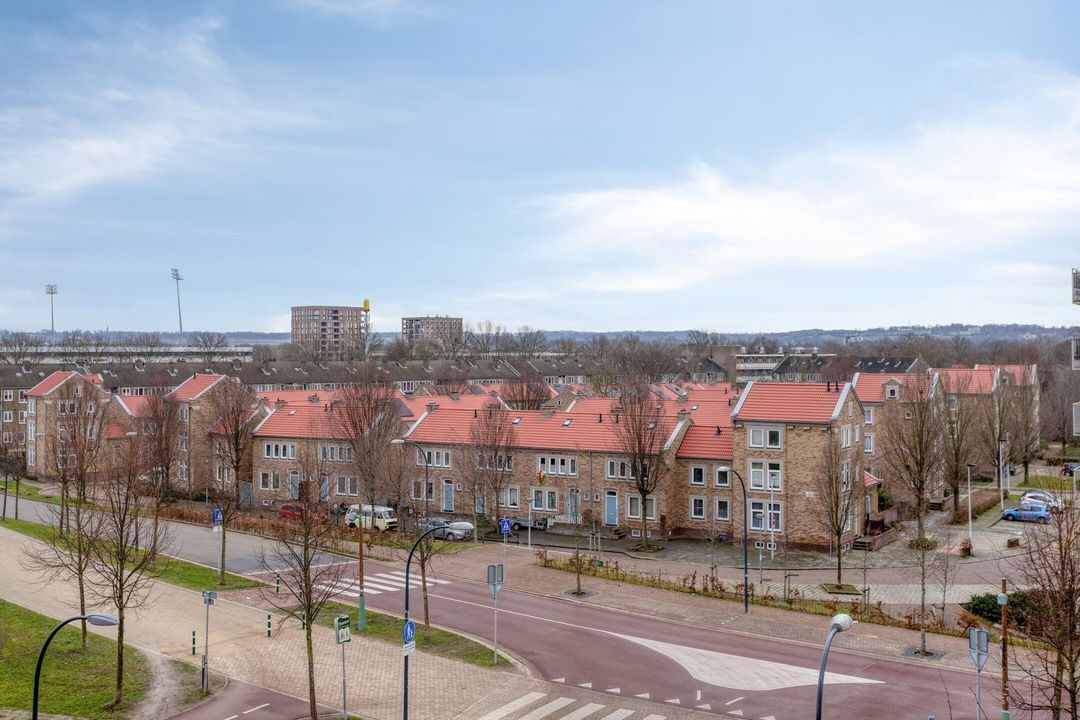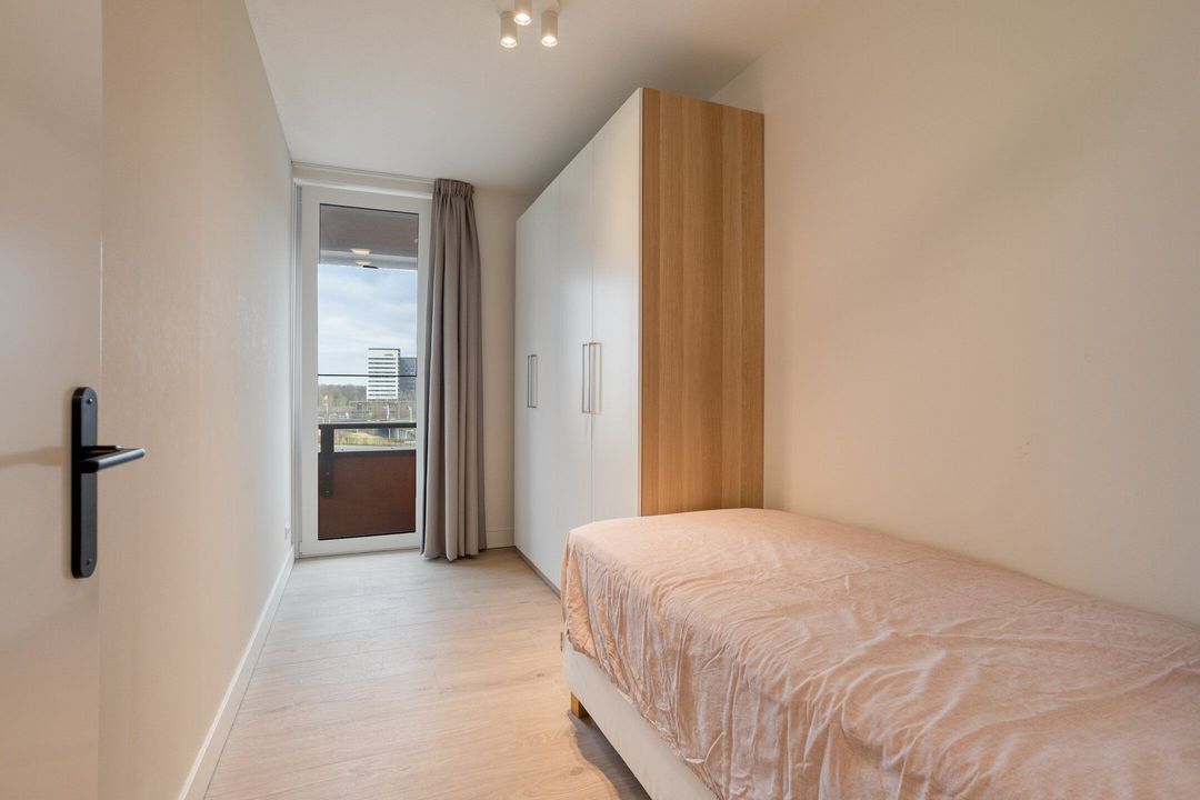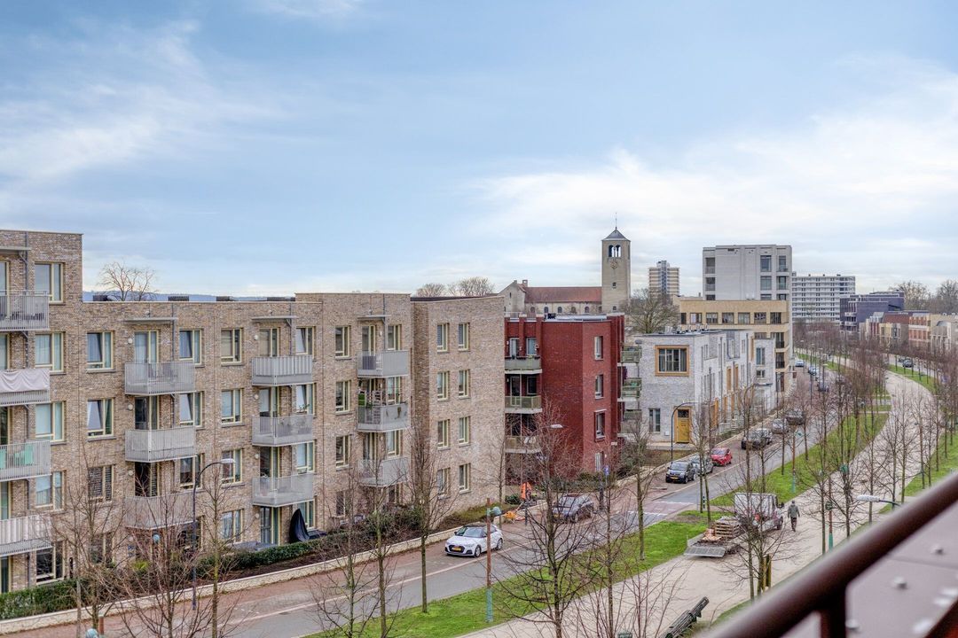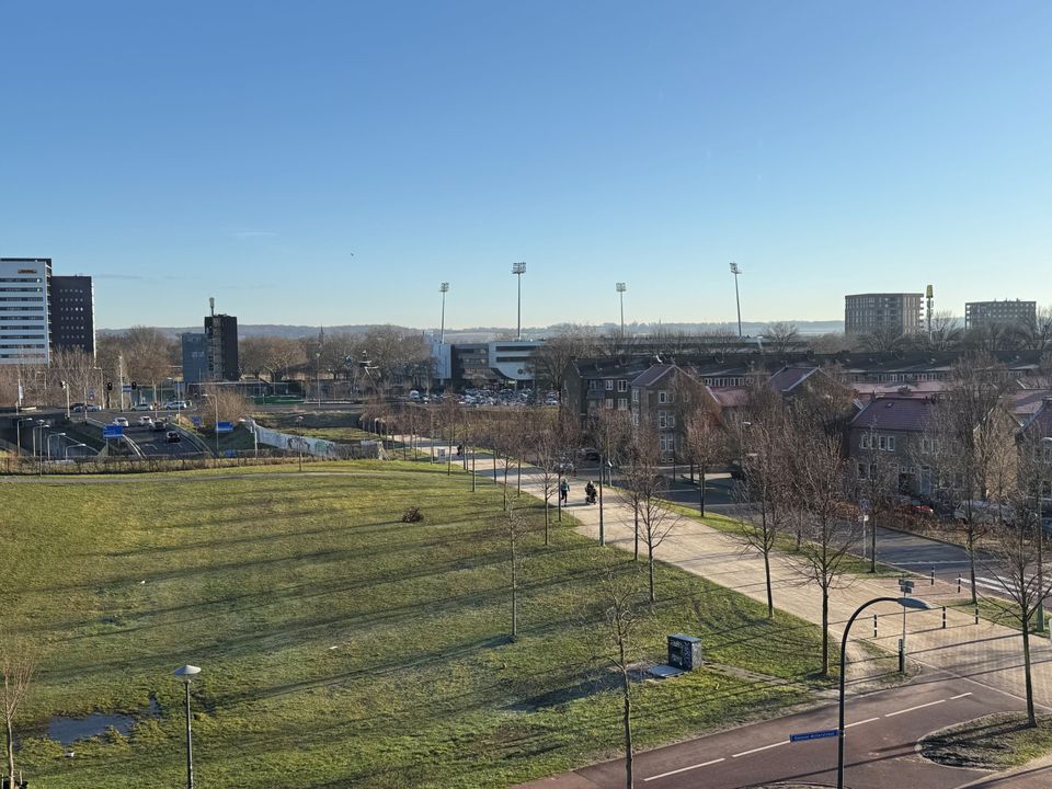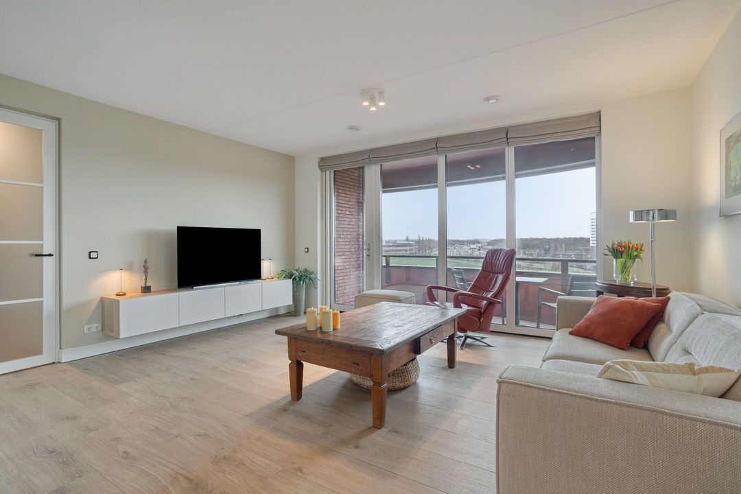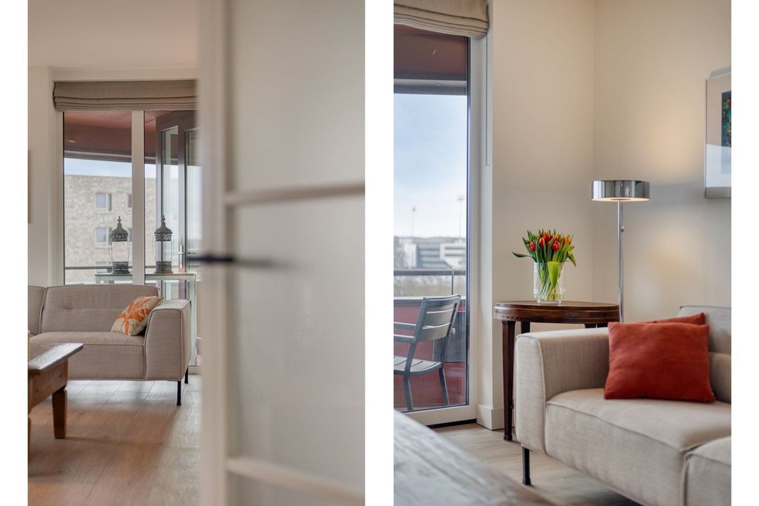 Het appartement is voorzien van een ruim en overdekt balkon, welke bereikbaar is via de deuren in de woonkamer, de eetkamer en de slaapkamer. Het overdekte balkon van ca. 24 m² strekt zich rondom het appartement uit en biedt een prachtig uitzicht op de Groene Loper en de stad. Dankzij de overkapping is het hier heerlijk zitten, zowel op warme als koelere dagen.