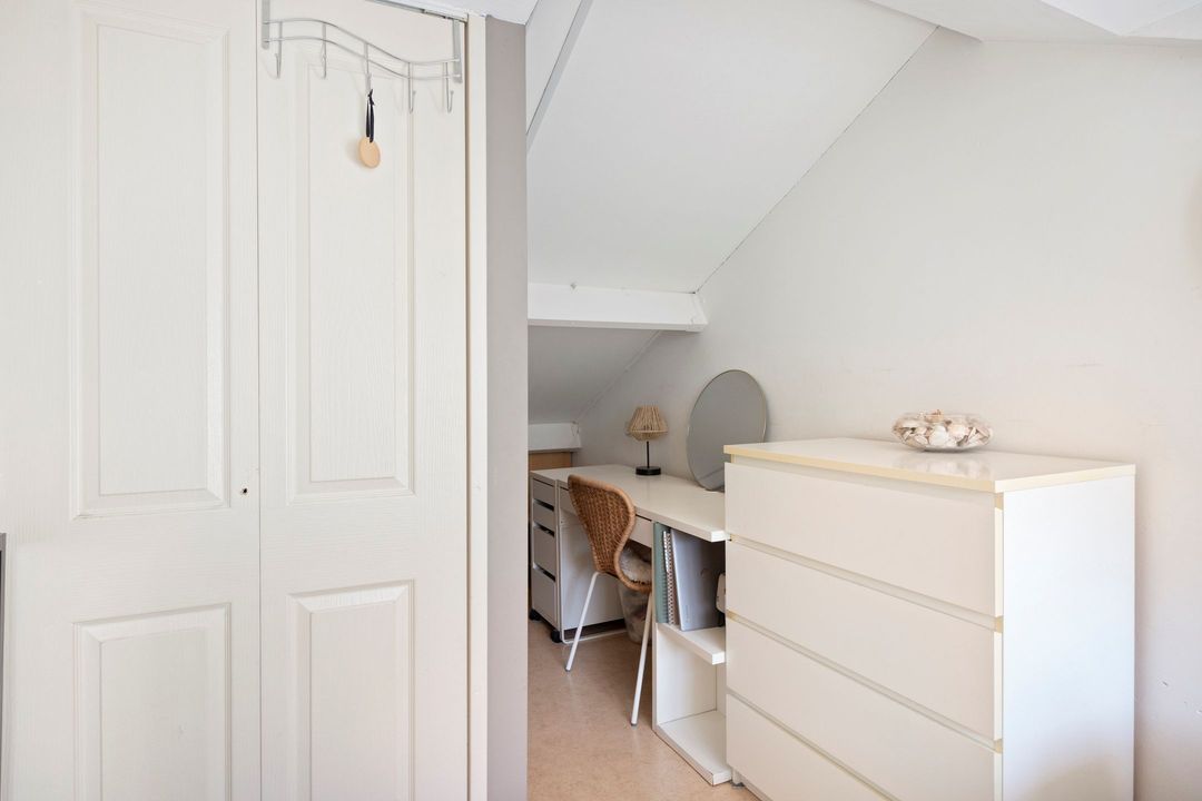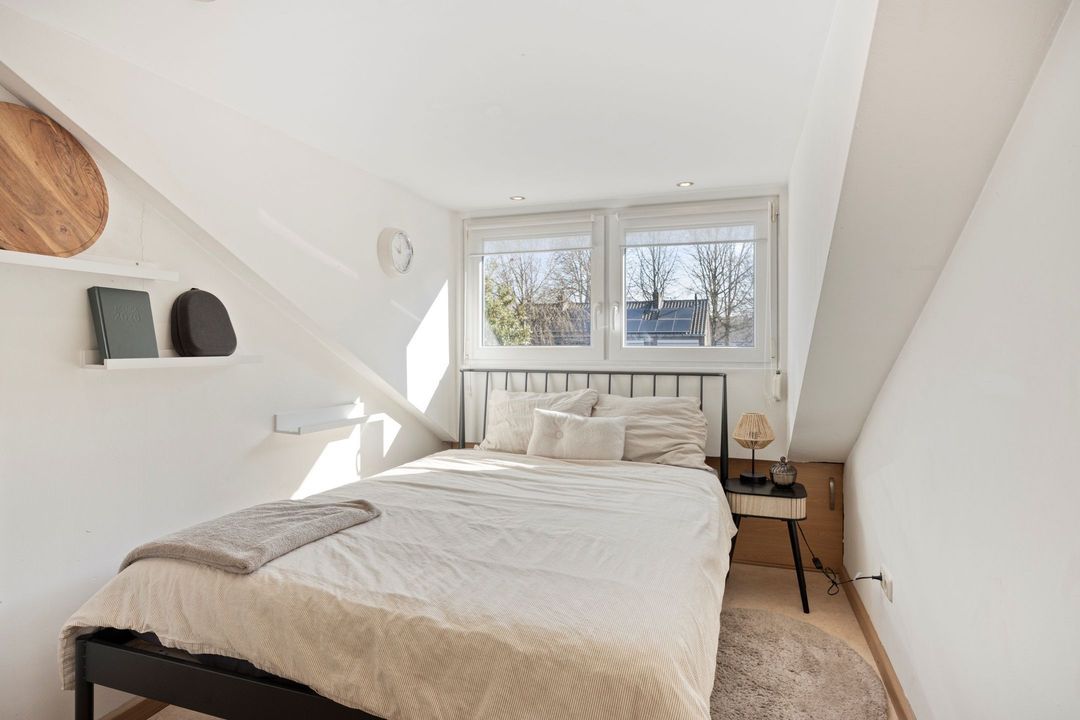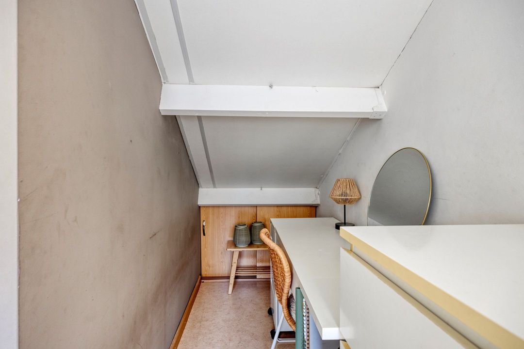 • Slaapkamer 4: Deze slaapkamer is ca. 9,5 m² groot en bereikbaar via de vaste trap in de gang. Deze kamer is tevens voorzien van veel bergruimte in de schuine delen.