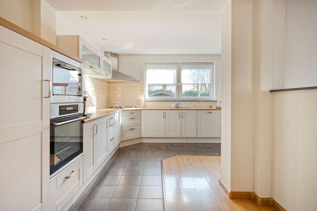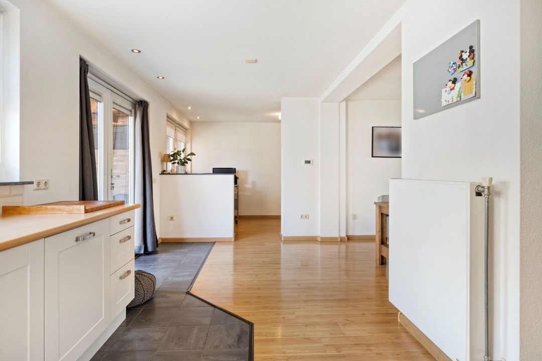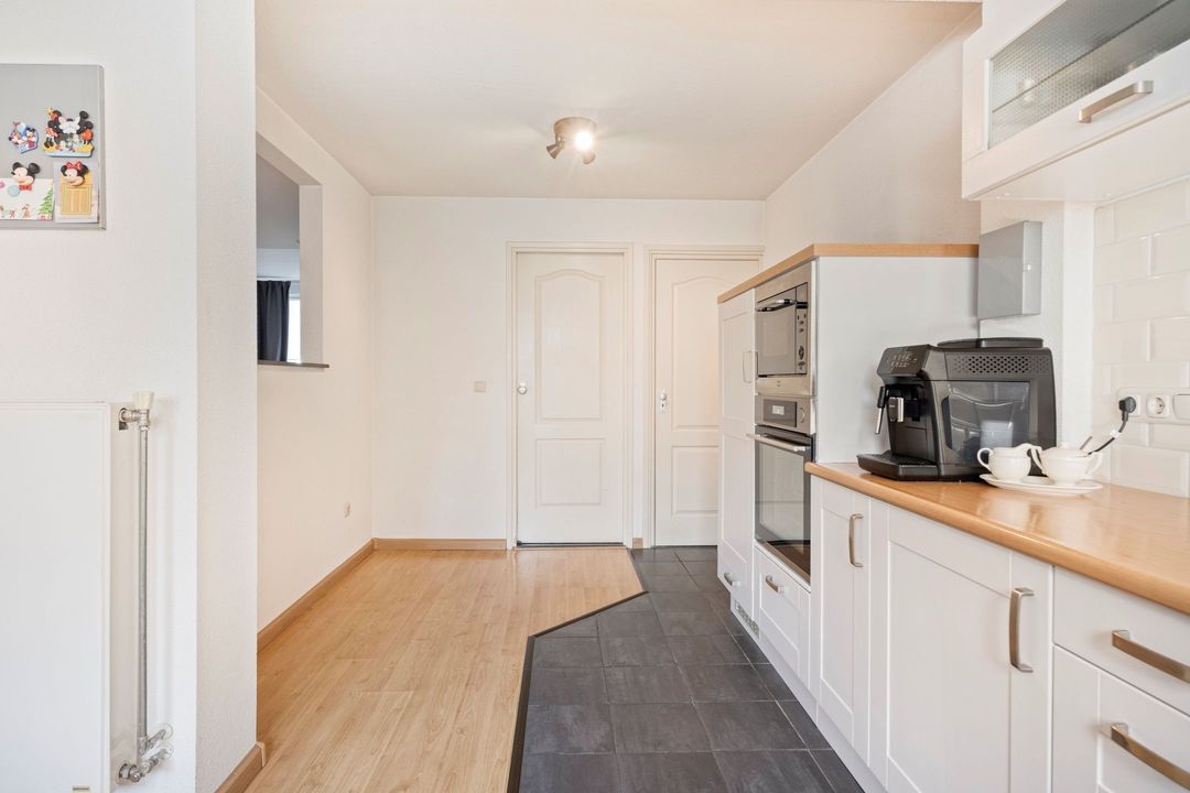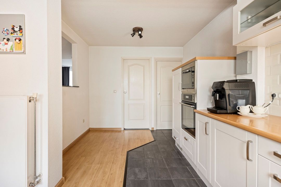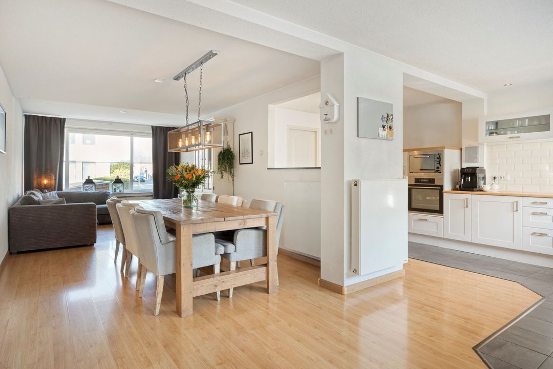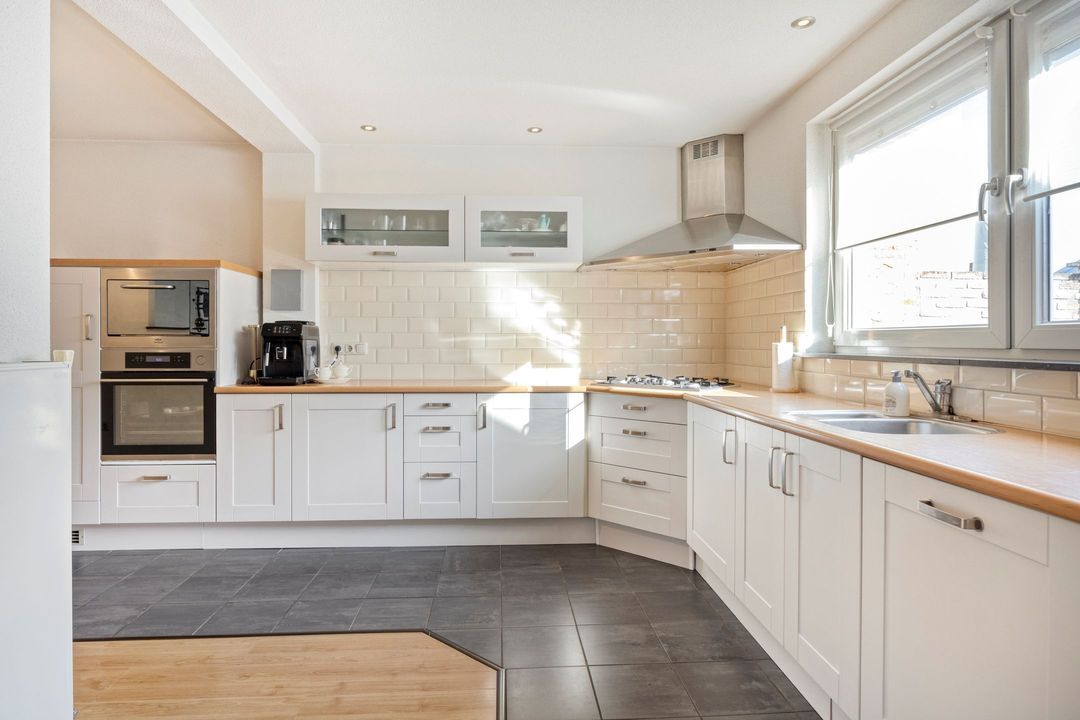 De woonkamer en semi-open keuken beslaan gezamenlijk ca. 60 m² en vormen een lichte, uitnodigende leefruimte. De keuken, gepositioneerd aan de achterzijde van de woning in een L-opstelling, is compleet uitgerust met een 5-pits gasfornuis, afzuigkap, oven, magnetron, koelkast en vaatwasser. Dankzij de open verbinding met de woonkamer heeft u prettig contact met het zitgedeelte en een mooi zicht op de tuin.