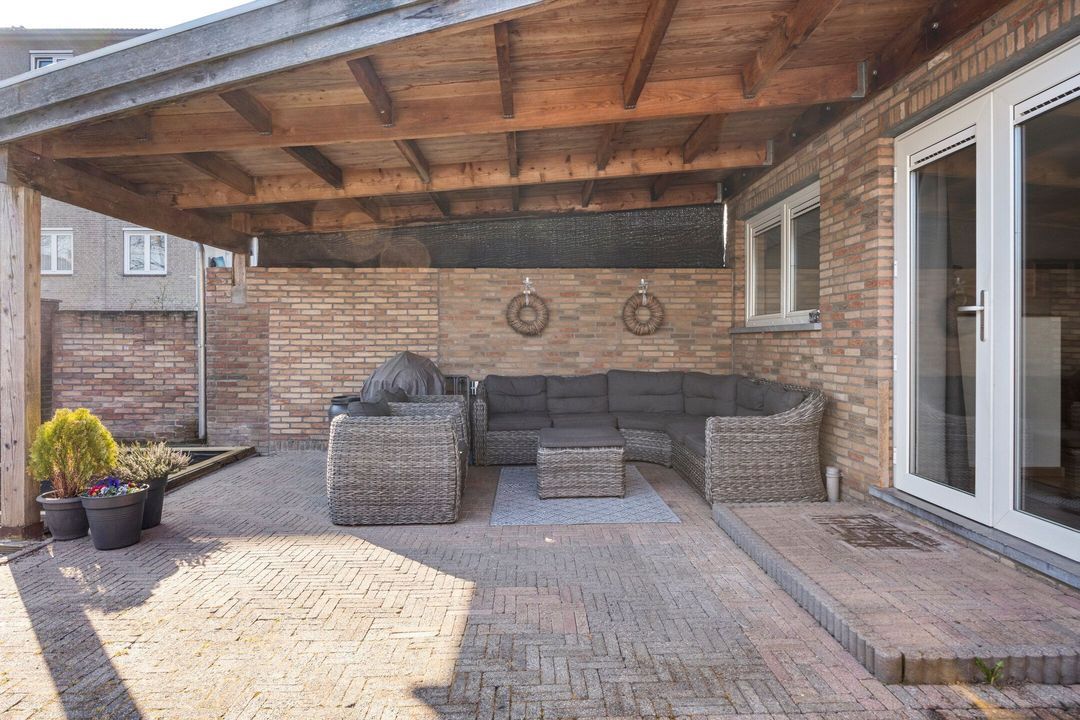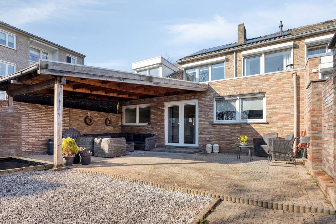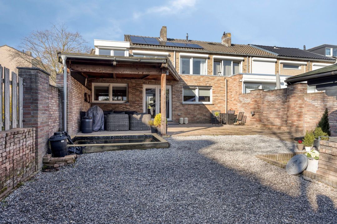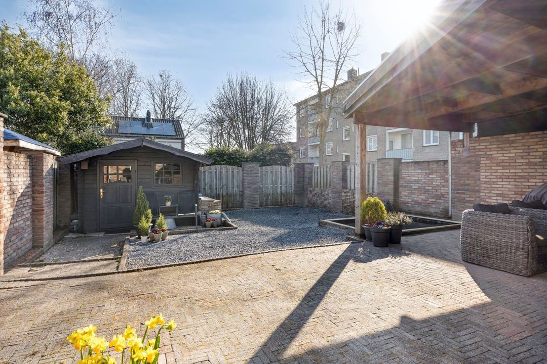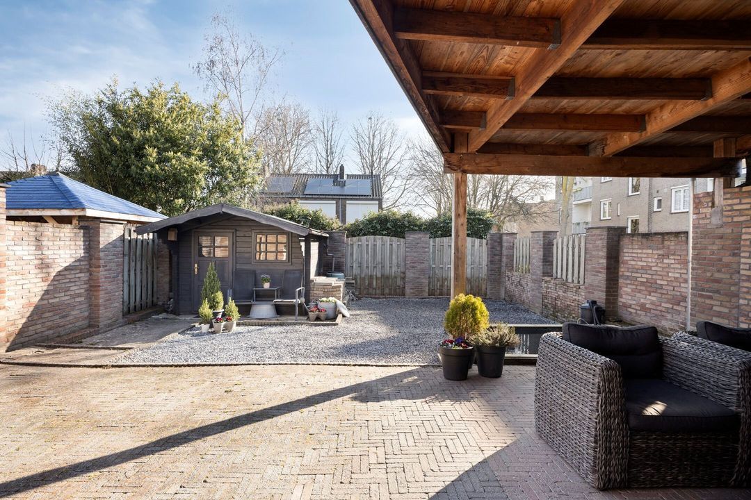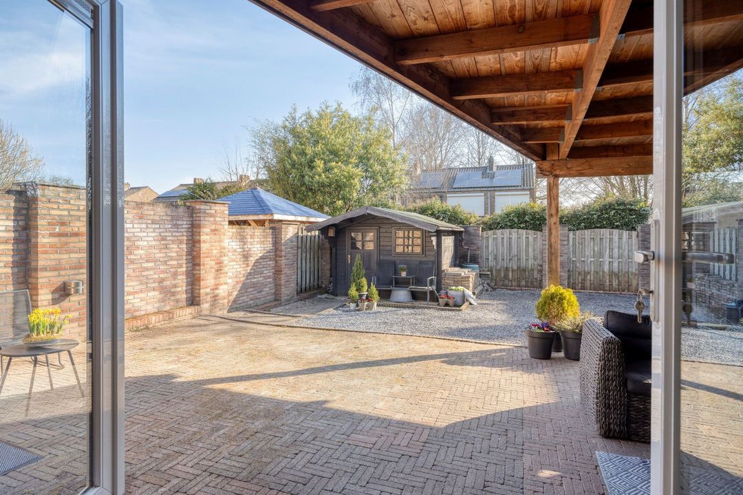 De woning beschikt over een royale, omsloten en fraai aangelegde tuin, direct bereikbaar vanuit de leefruimte. De tuin is smaakvol ingericht met een ruim terras, siergrind, een sfeervolle vijver en diverse plantenborders, wat een rustige en groene buitenruimte creëert. Aan de woning grenst een ruime overkapping van ca. 24 m², ideaal om beschut te zitten en te ontspannen. Achter in de tuin bevindt zich een praktische berging (ca. 7 m²), perfect voor het opbergen van tuingereedschap of materialen, en in de voortuin is bovendien een handige fietsenberging aanwezig. Dankzij de royale opzet, verzorgde inrichting en veelzijdige mogelijkheden is de tuin perfect voor gezinnen, tuinliefhebbers of iedereen die van het buitenleven wil genieten.