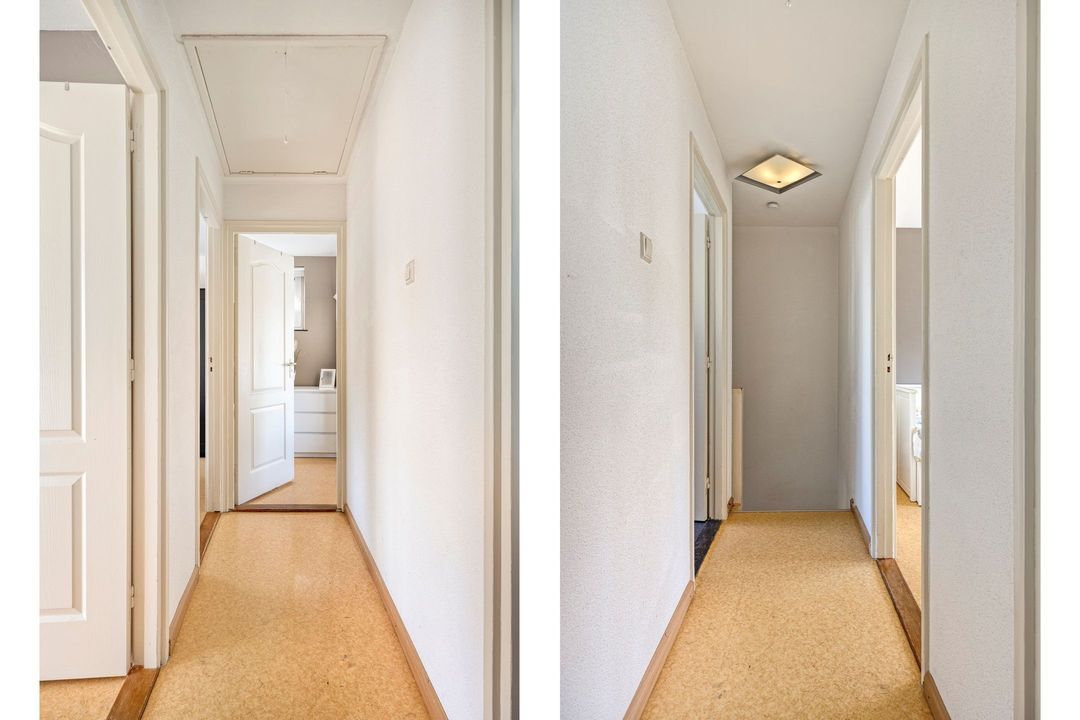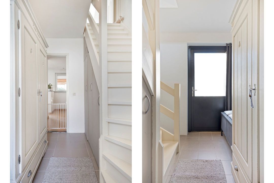 Via de trap in de entree bereikt u de overloop van de eerste verdieping, vanwaar u toegang heeft tot drie slaapkamers, de badkamer en de vlizotrap naar de zolder. De vierde slaapkamer is bereikbaar via de vaste trap in de gang.