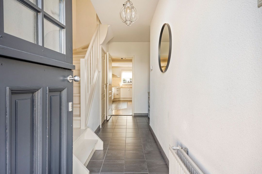Bij binnenkomst wordt u verwelkomd in de ruime, verzorgde entree van ca. 9 m², voorzien van een stijlvolle donkere tegelvloer. Vanuit de entree heeft u toegang tot de meterkast, de volledig betegelde toiletruimte met staand closet, en de semi-open keuken. Tevens vindt u hier de trap naar zowel de kelder als de eerste verdieping.
