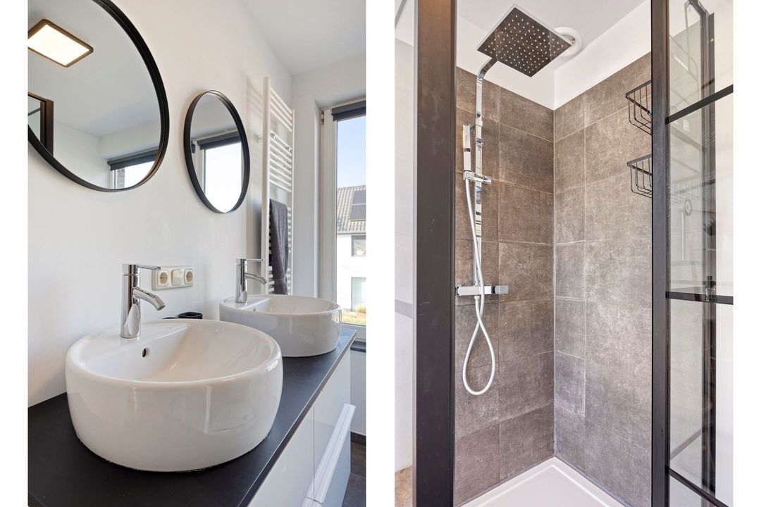 • Badkamer: De moderne, betegelde badkamer is ca. 6 m² groot en uitgerust met een doucheruimte, een wastafelmeubel en een hangcloset toilet.