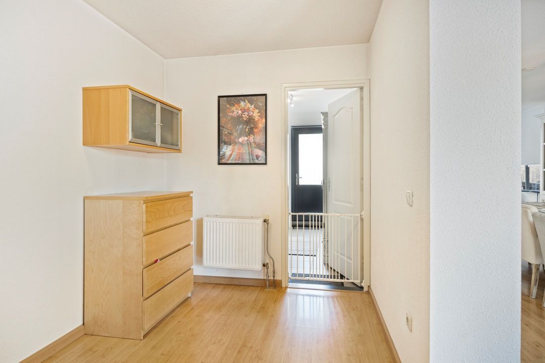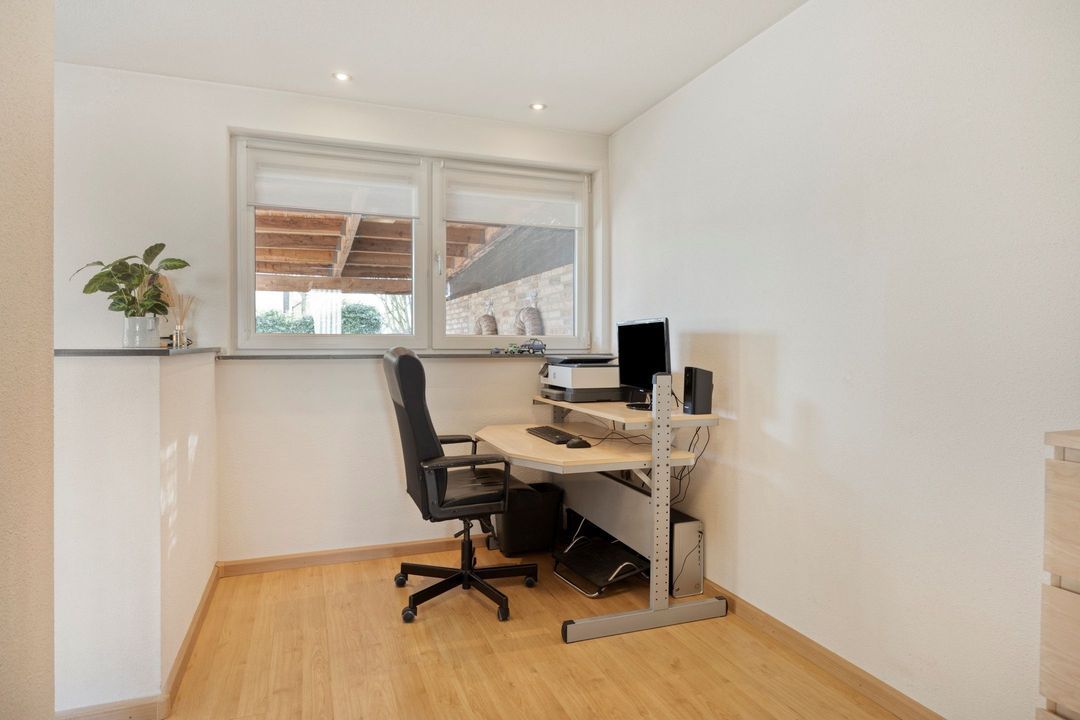 Aan de woonkamer grenst een gedeeltelijk afgescheiden ruimte, ideaal in te richten als kantoor aan huis, speelkamer of hobbyruimte. Vanuit deze ruimte bereikt u een gang van ca. 7 m² met een aparte ingang naar de woning, een vaste trap naar de vierde slaapkamer en een praktische trappenkast, perfect voor extra opbergruimte.