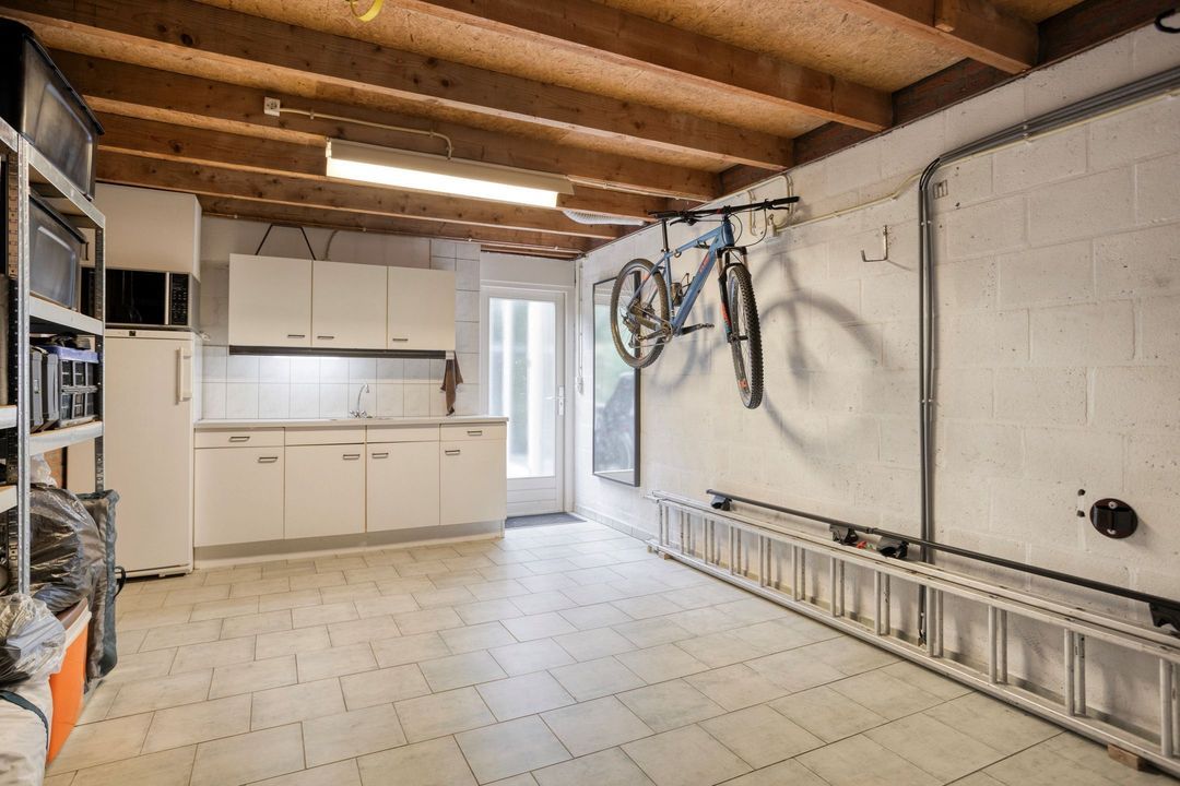 De woning beschikt over een ruime garage van circa 19 m², bereikbaar via de tuin of de openslaande deuren aan de oprit. De garage is voorzien van elektra en water, en is geschikt voor het parkeren van een auto, het stallen van fietsen of het opbergen van spullen. Tevens is er een praktisch keukenblok aanwezig met extra opbergruimte, ideaal voor werk- of hobbydoeleinden. De oprit biedt voldoende plek voor het parkeren van een of twee auto's.
