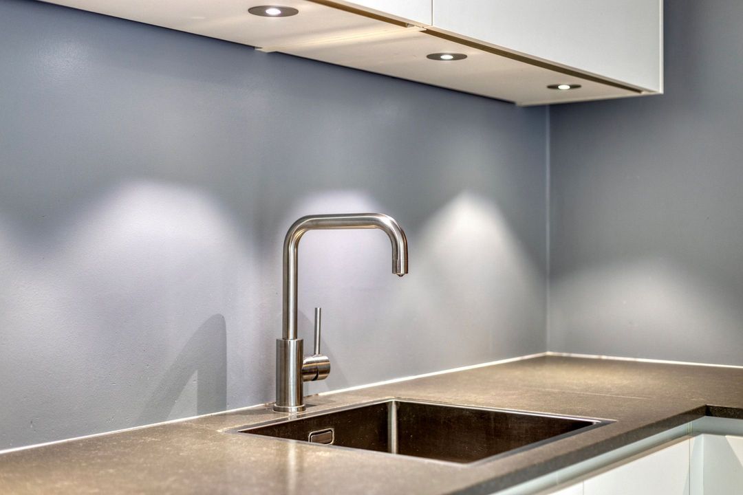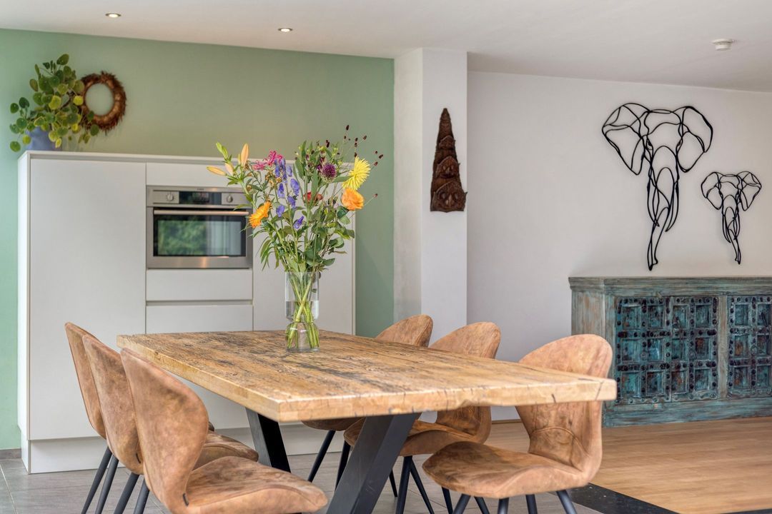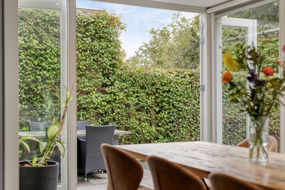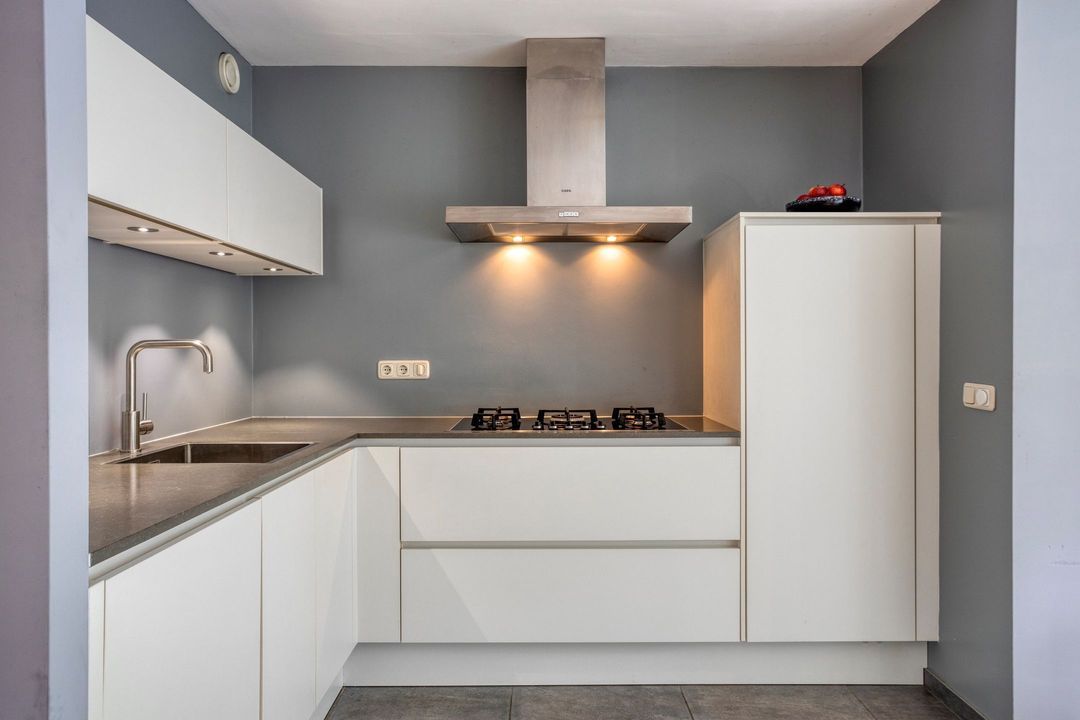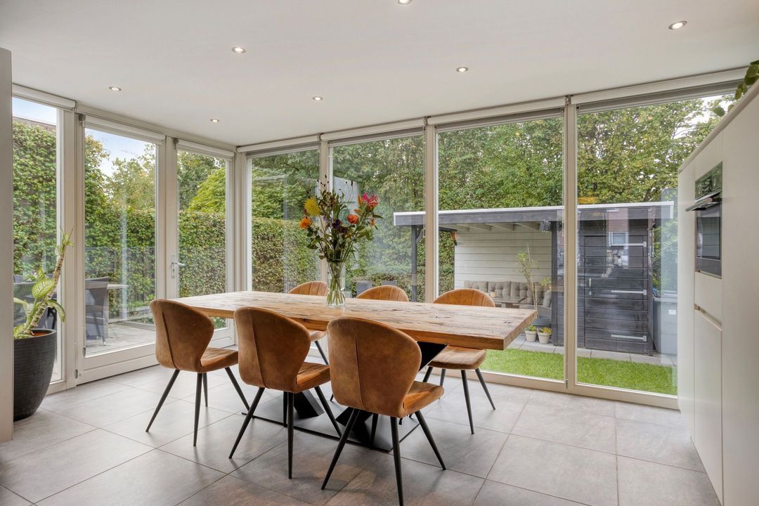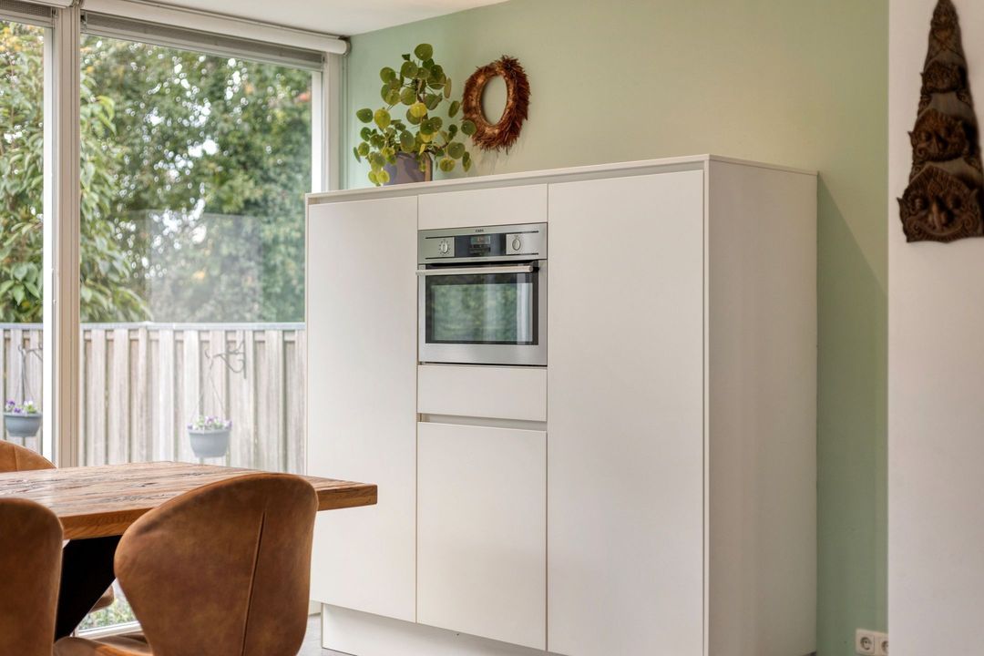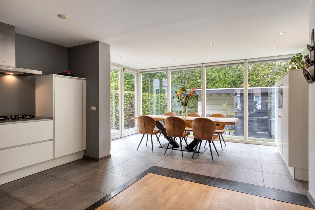 De moderne, L-vormige keuken is gesitueerd aan de achterzijde van de woning en voorzien van een tegelvloer en vloerverwarming. De keuken, uitgevoerd met witte, greeploze fronten, is volledig uitgerust met een 5-pits gasfornuis, afzuigkap, combi-oven, koelkast, vaatwasser (2024) en biedt veel werk- en bergruimte. Dankzij de grote raampartijen en de deur naar de tuin ervaart u een gevoel van openheid en verbinding met de buitenruimte. De aanbouw is bovendien voorzien van rolgordijnen op maat.