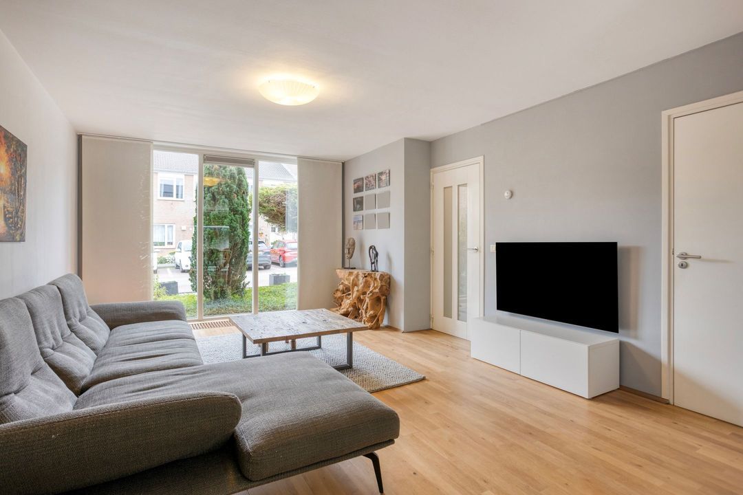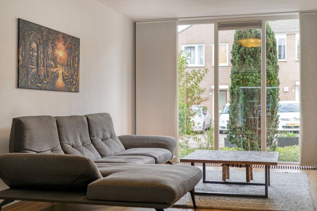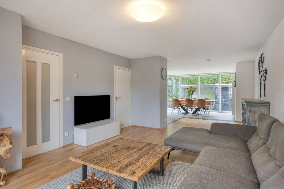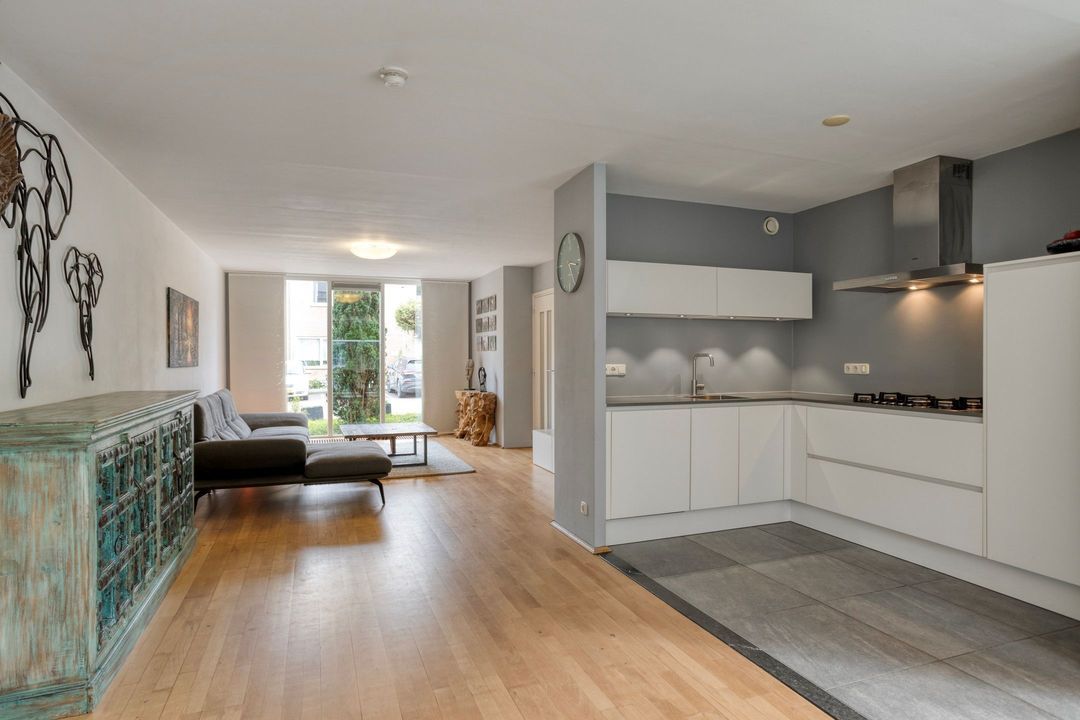 De uitgebouwde woonkamer met open keuken biedt samen een comfortabele leefruimte van circa 51 m². Grote raampartijen aan zowel de voor- als achterzijde zorgen voor een overvloed aan natuurlijk licht. De doorlopende parketvloer vanuit de entree versterkt de rustige en harmonieuze uitstraling van de leefruimte. Praktisch is bovendien de aanwezige trappenkast, ideaal voor het opbergen van diverse spullen.