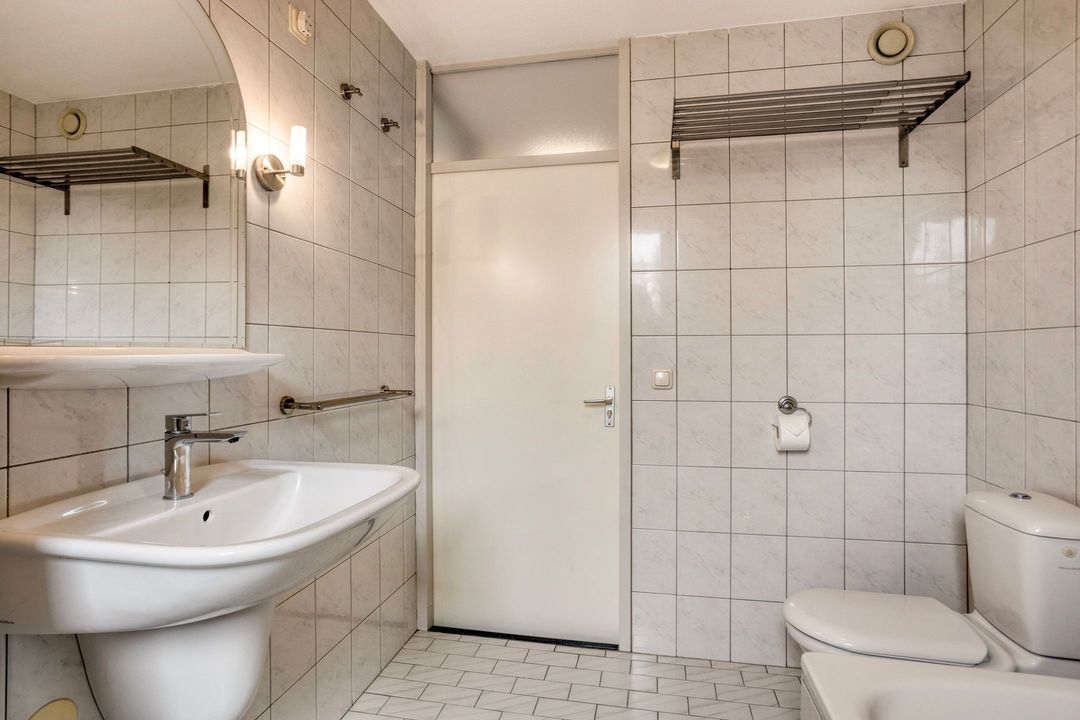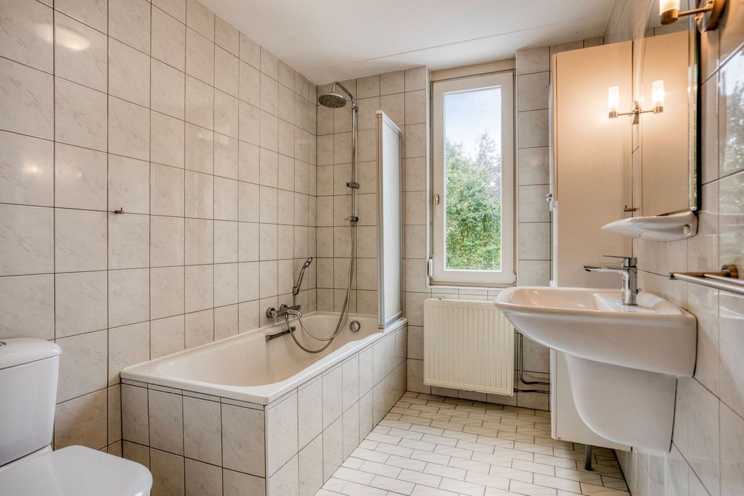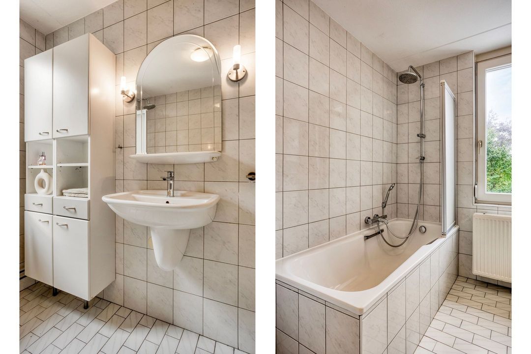 • Badkamer: De goed onderhouden, betegelde badkamer van circa 6 m² is praktisch ingedeeld met een wastafel, een hangcloset en een ligbad met douche.