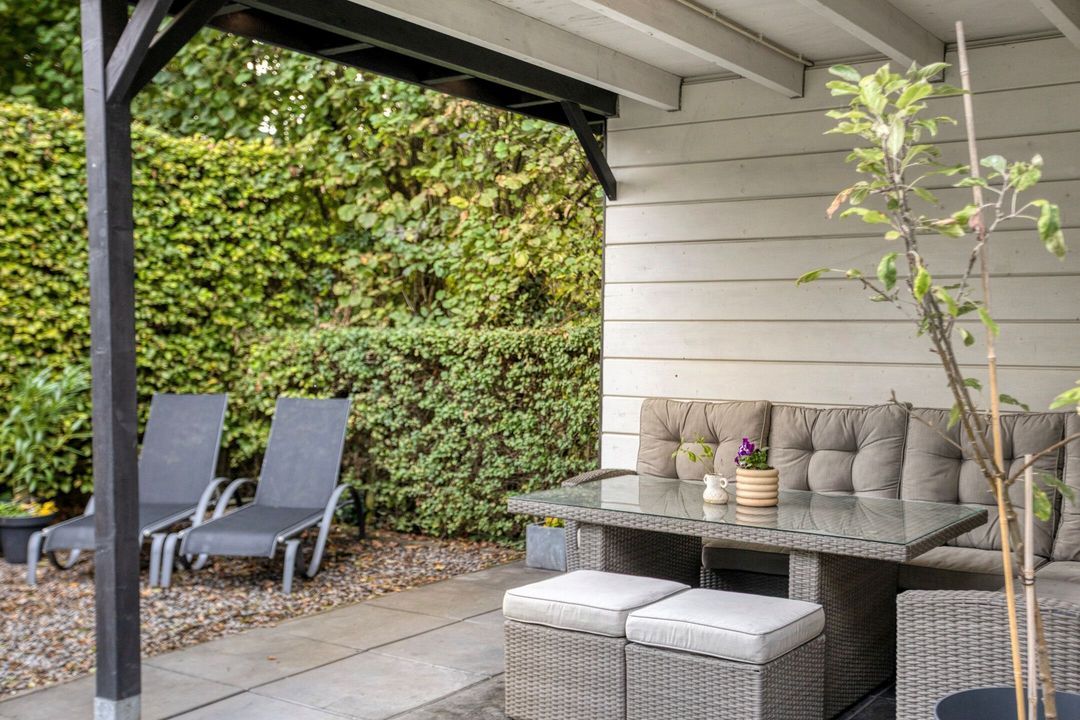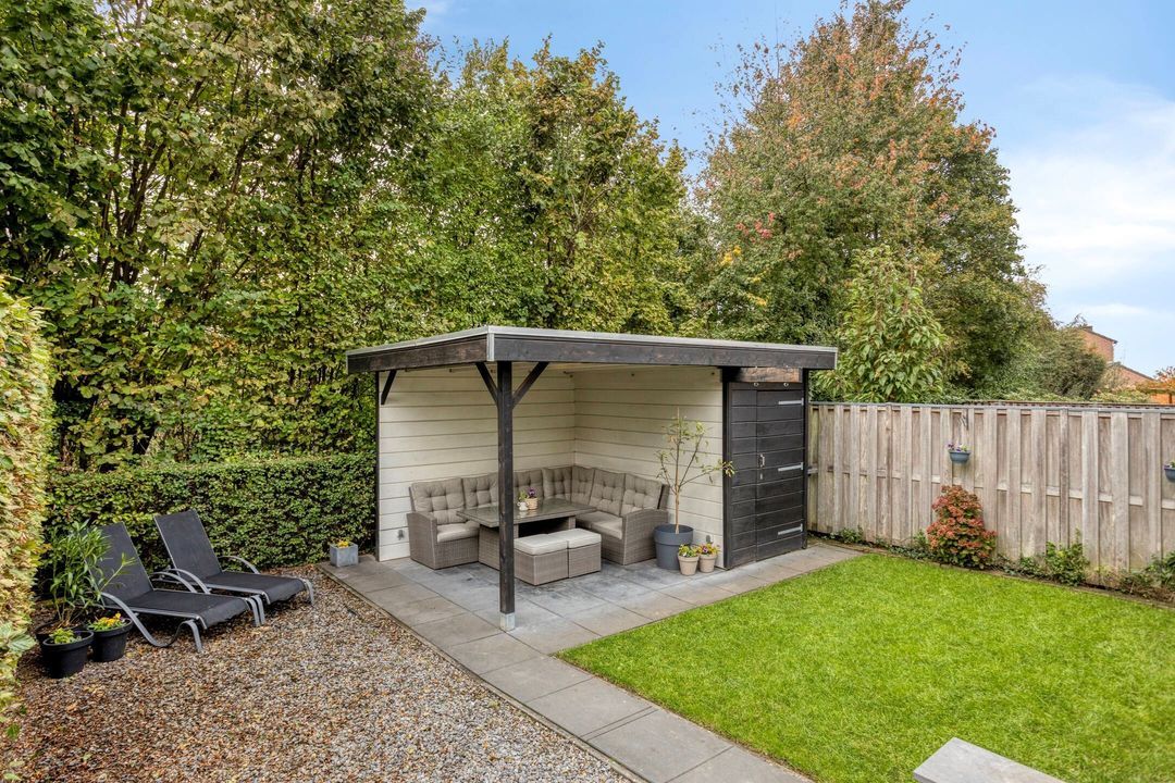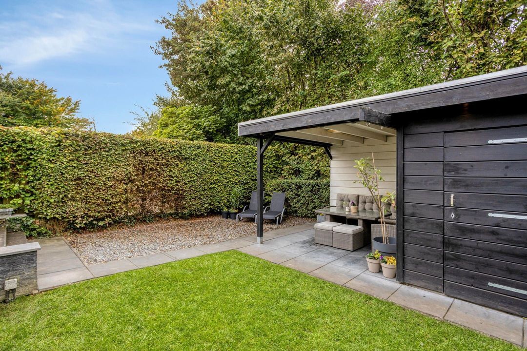 De sfeervolle achtertuin is bereikbaar via de deuren in de woonkamer of via de garage. De tuin is split-level aangelegd en bestaat uit een combinatie van terras, gazon en plantenborders. Aan de achterzijde van de tuin bevindt zich een praktische berging van circa 4,5 m², ideaal voor het opbergen van tuingereedschap en materialen. Aan de berging grenst een overkapping van circa 10 m², een heerlijke plek om te zitten, te ontspannen of buiten te tafelen, ongeacht het weer. De tuin biedt een prachtige balans tussen privacy, sfeer en functionaliteit.