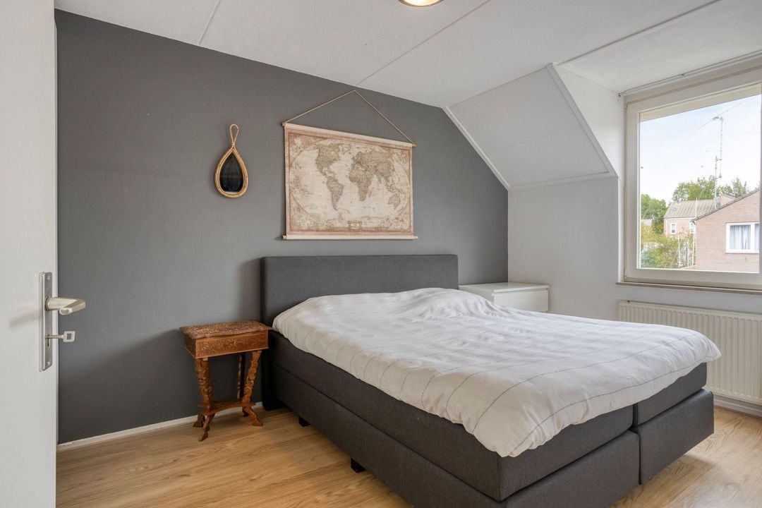 Via de trap in de entree bereikt u de eerste verdieping, waar drie slaapkamers en de badkamer zijn gesitueerd. De gehele verdieping is voorzien van een laminaatvloer, wat bijdraagt aan een rustige en verzorgde uitstraling.