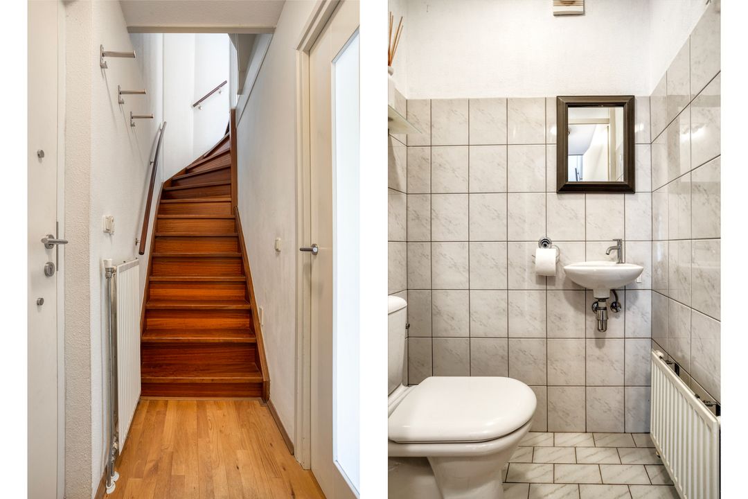 U betreedt de woning via een lichte en verzorgde entree van circa 4 m², voorzien van een fraaie parketvloer. Hier bevinden zich de meterkast, de toiletruimte, de trapopgang naar de eerste verdieping en de toegang tot de royale woonkamer met open keuken. De betegelde toiletruimte is uitgevoerd met een staand closet en een fonteintje.