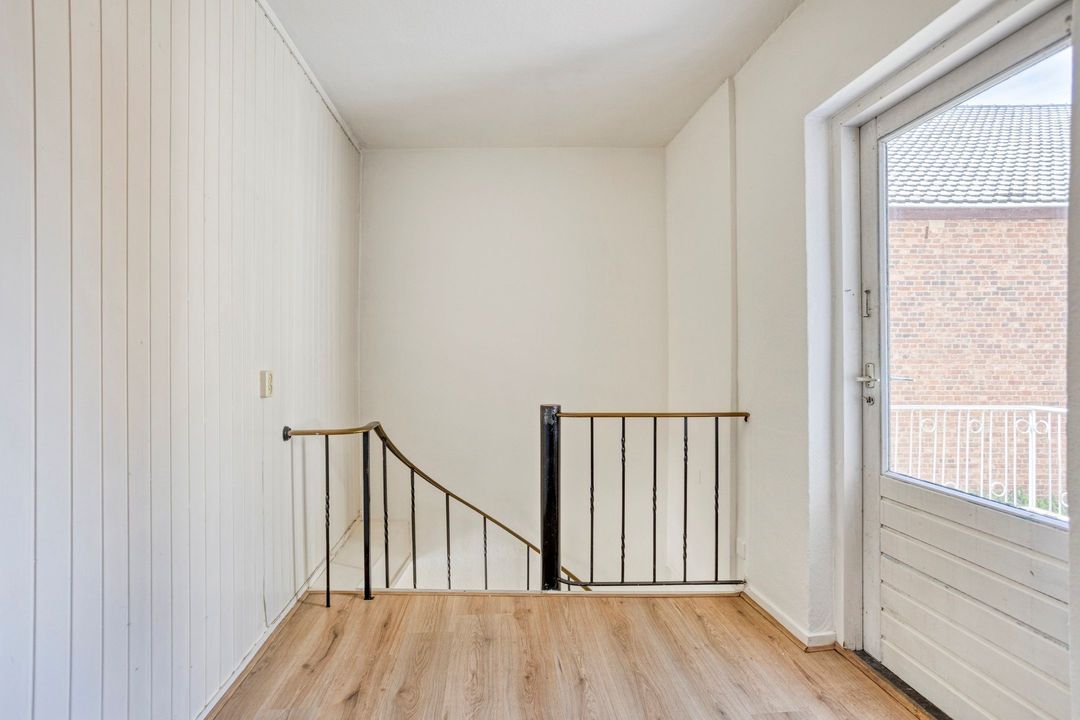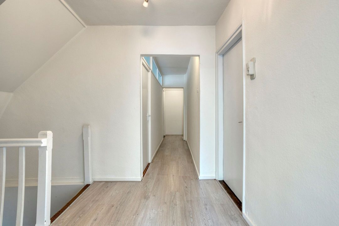 Via de trap in de keuken/eetkamer komt u op de eerste verdieping. De royale overloop (ca. 15 m²) biedt toegang tot drie slaapkamers en de badkamer. Tevens is er een vaste trap naar de zolderverdieping.