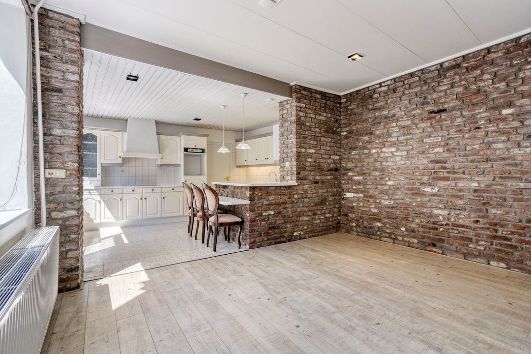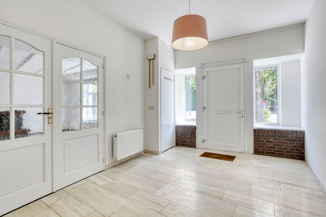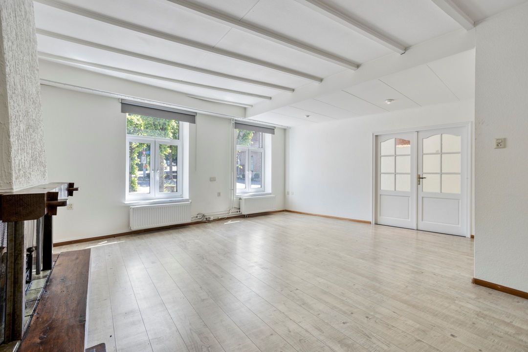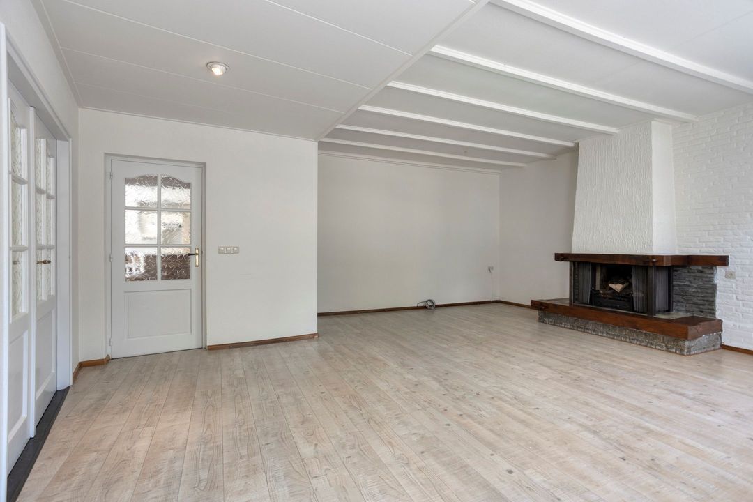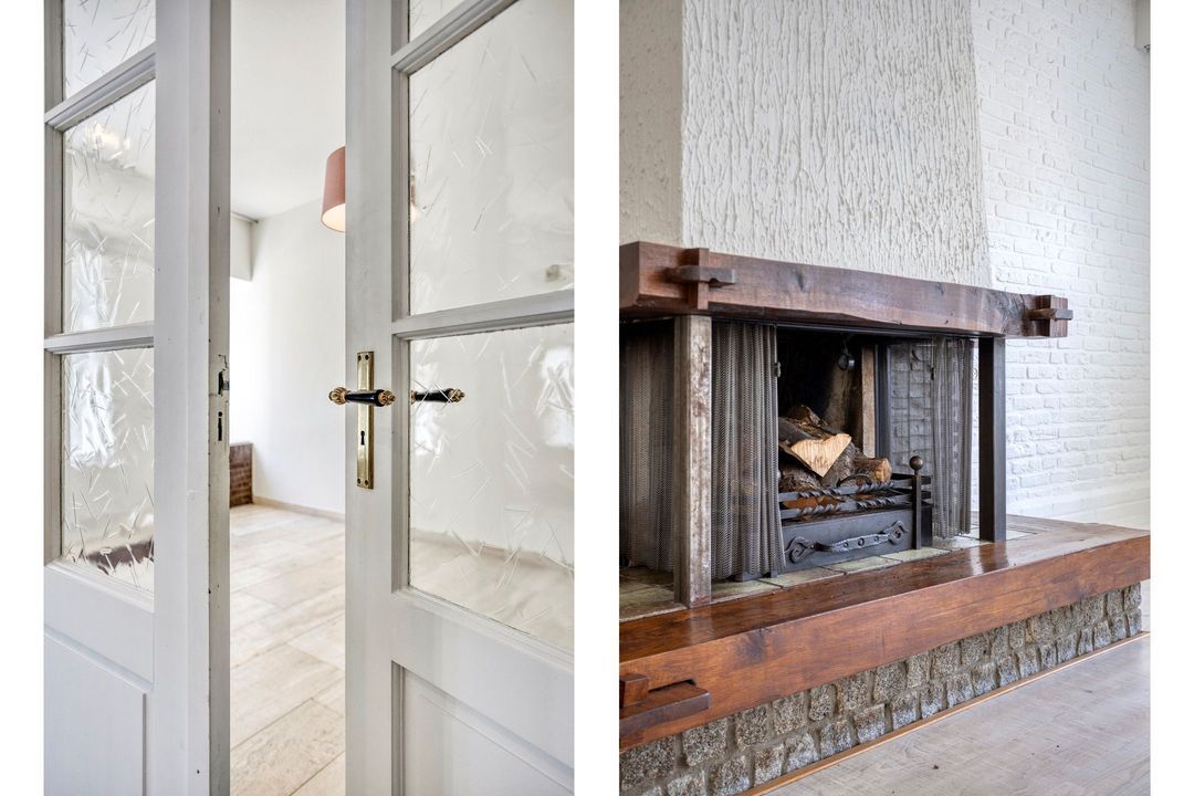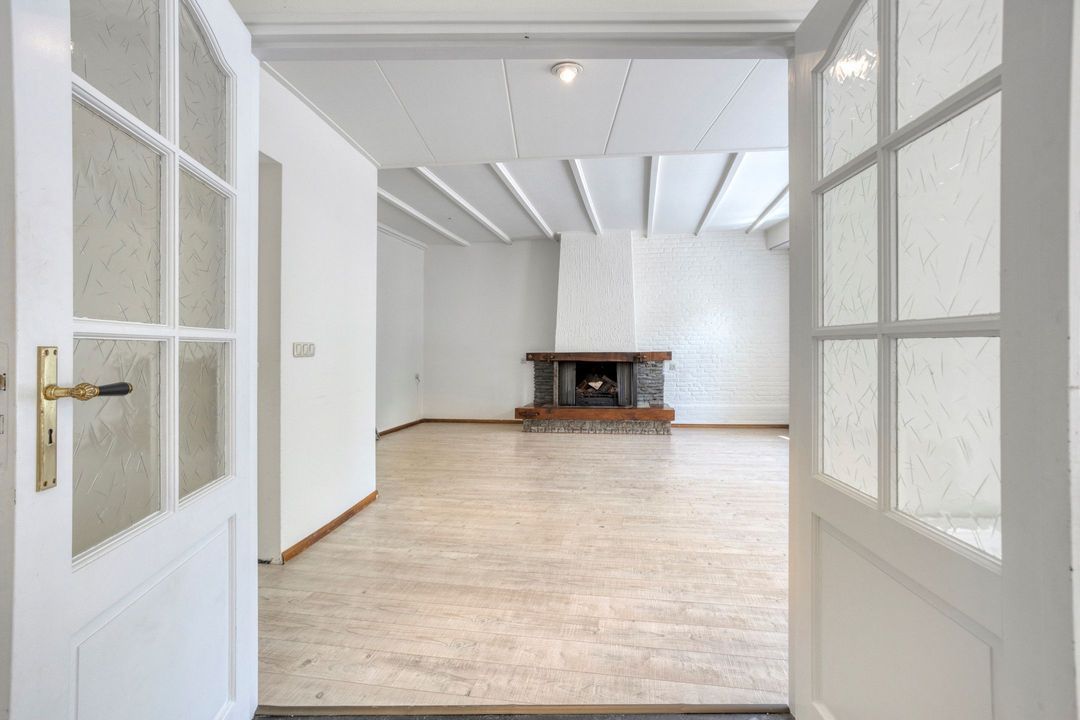 Via de ruime entree van circa 15 m², afgewerkt met een stijlvolle, lichte tegelvloer, krijgt u direct toegang tot de meterkast en de woonkamer. De sfeervolle woonkamer van ongeveer 33 m² valt op door de overvloedige natuurlijke lichtinval en de karakteristieke details, zoals de authentieke houten plafondbalken en de centraal geplaatste haard, die het hart van de ruimte vormt.