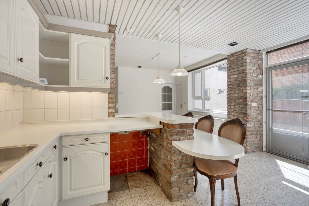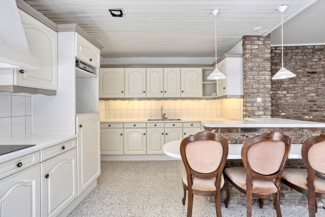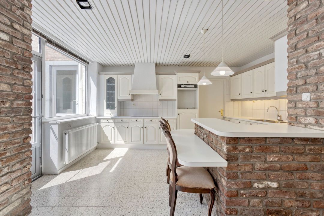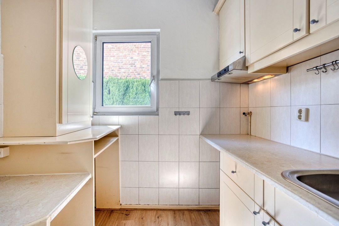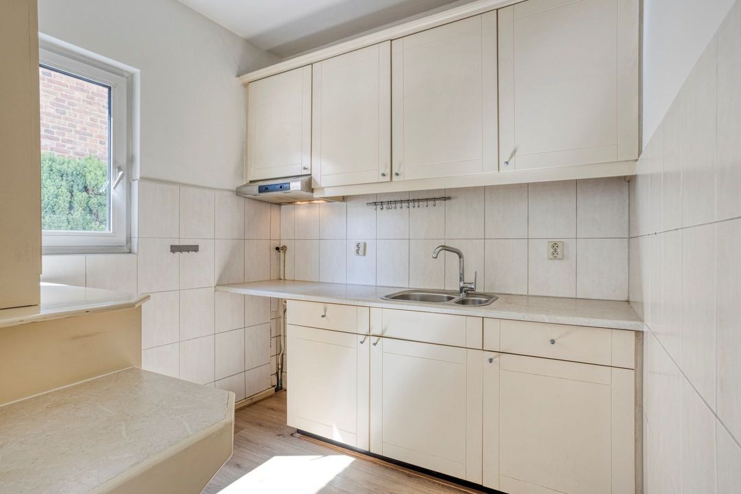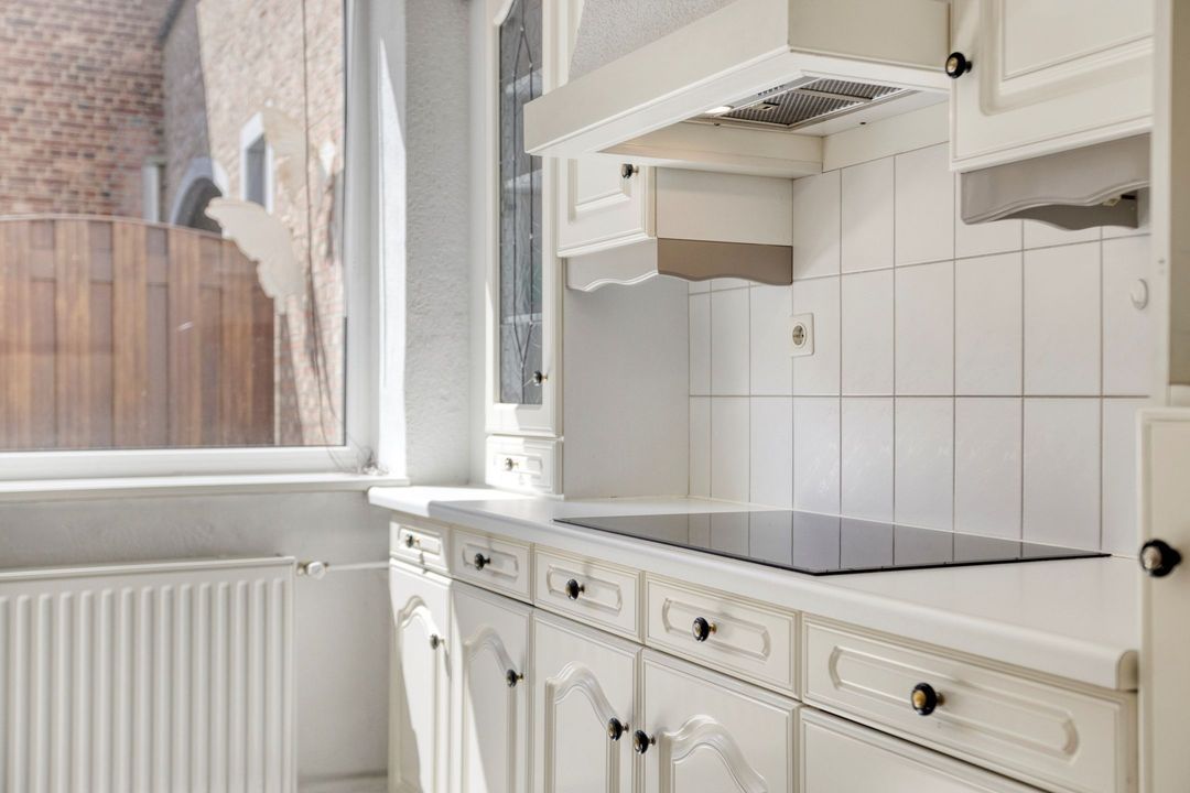 De verzorgde keuken, gelegen aan de achterzijde van de woning, is van alle gemakken voorzien en uitgerust met diverse inbouwapparatuur, waaronder een inductiekookplaat (2020), afzuigkap en koelkast. Ruimte voor werk en opslag is ruim aanwezig. Vanuit de keuken heeft u directe toegang tot zowel de achtertuin als de bijkeuken.
