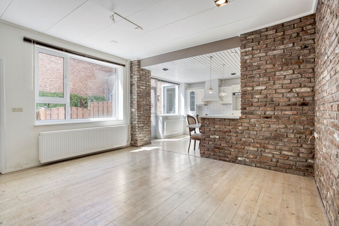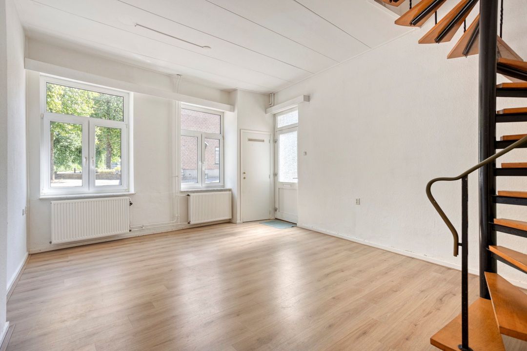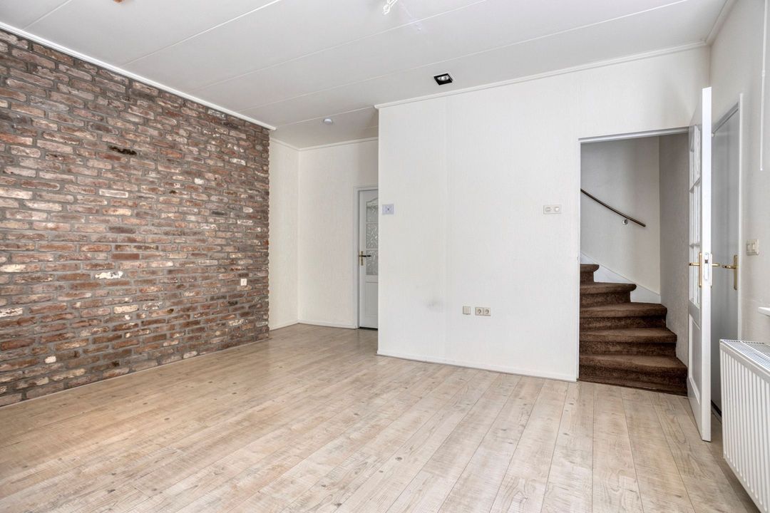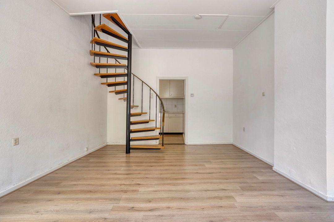 De woning is te betreden via de voordeur aan de zijkant van het huis. Bij binnenkomst treft u de ruime woonkamer van circa 28 m², die dankzij de raampartijen aan de voorzijde wordt overspoeld met aangenaam natuurlijk licht. In deze leefruimte bevinden zich de meterkast, een fraaie wenteltrap naar de eerste verdieping en de doorgang naar de keuken.