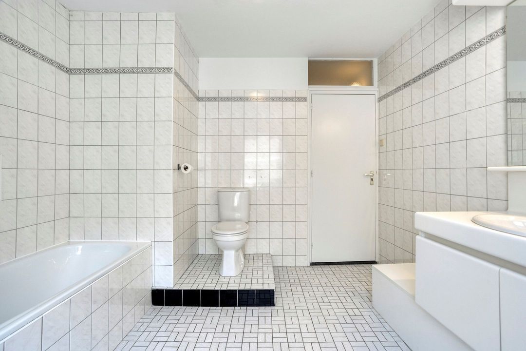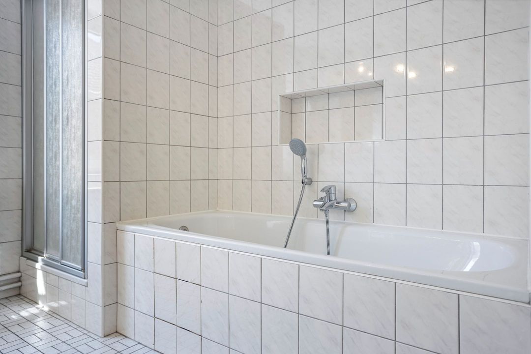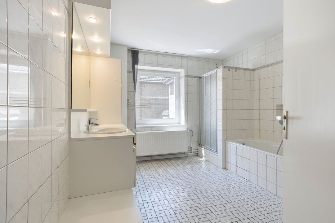 • Badkamer: De nette, volledig betegelde badkamer (ca. 11 m²) is uitgerust met een ligbad, douchecabine, wastafel en een staand toilet.