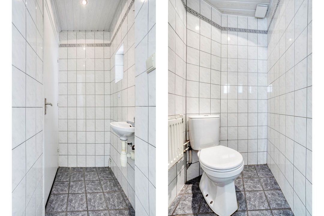Aansluitend bereikt u via een deur de keuken/eetkamer, eveneens circa 33 m². Hier bevinden zich tevens de toegang tot de toiletruimte, de trap naar de eerste verdieping en de trap naar de kelder. De toiletruimte is volledig betegeld en voorzien van een fonteintje en een staand toilet.