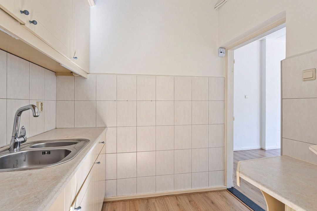 De verzorgde keuken van circa 5 m² is praktisch ingedeeld en voorzien van een afzuigkap en voldoende opbergruimte. Daarnaast is hier de cv-ketel (Remeha, 2005) geplaatst, wat zorgt voor een compacte en functionele inrichting.